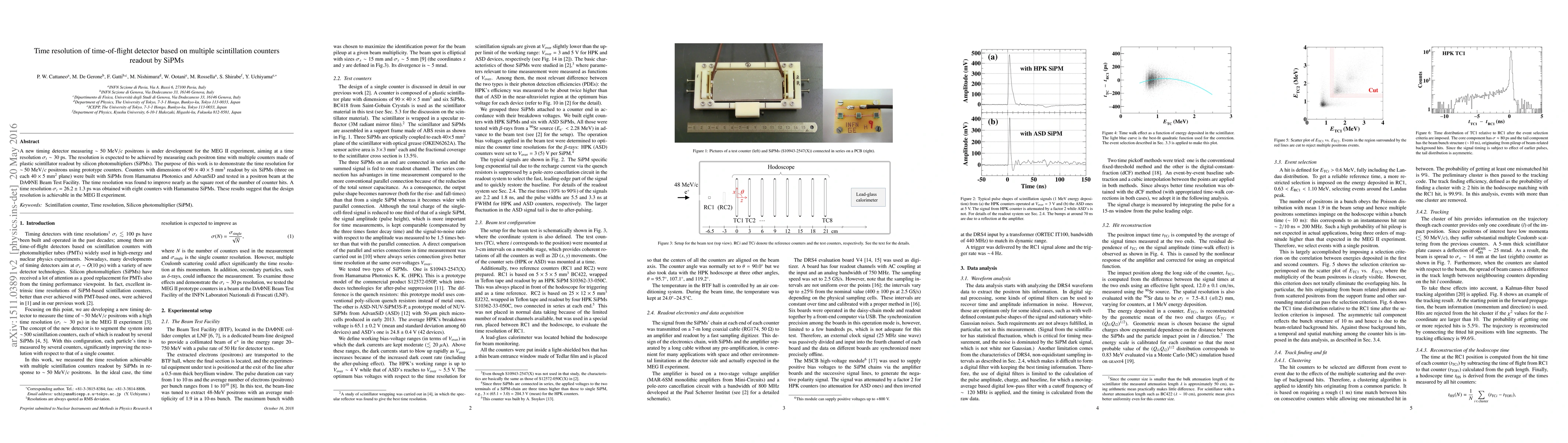 This paper develops a new time-of-flight detector for the MEG II experiment, aiming for a time resolution of 30 ps by using multiple plastic scintillator counters read out by silicon photomultipliers. The prototype achieved a time resolution of 26.2±1.3 ps, indicating the design's feasibility.