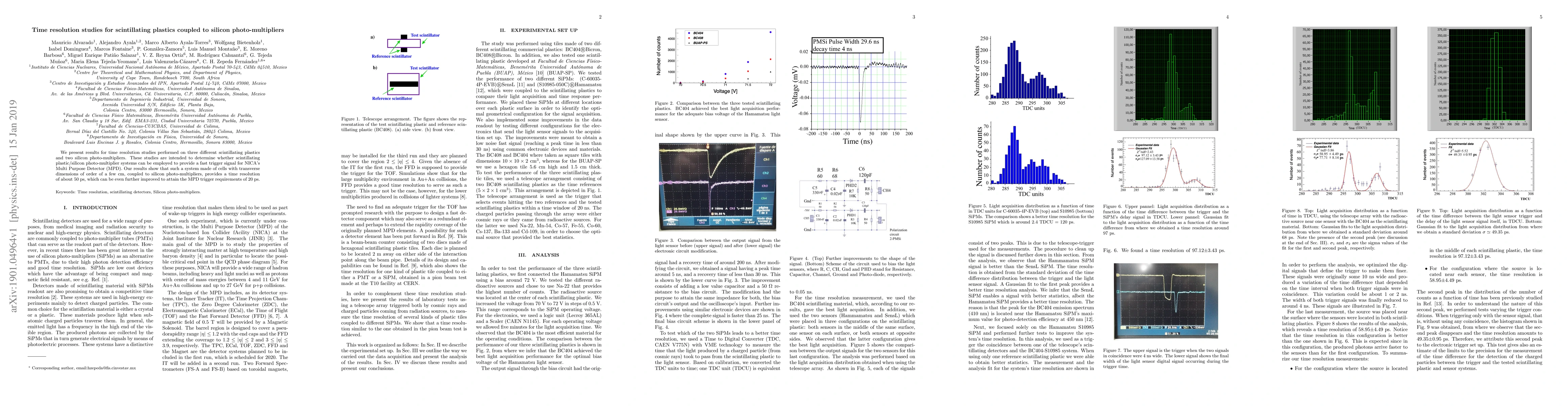 We present results for time resolution studies performed on three different scintillating plastics and two silicon photo-multipliers. These studies are intended to determine whether scintillating plastic/silicon photo-multiplier systems can be employed to provide a fast trigger signal for NICA's Multi Purpose Detector (MPD). Our results show that such a system made of cells with transverse dimensions of order of a few cm, coupled to silicon photo-multipliers, provides a time resolution of about 50 ps, which can be even further improved to attain the MPD trigger requirements of 20 ps.