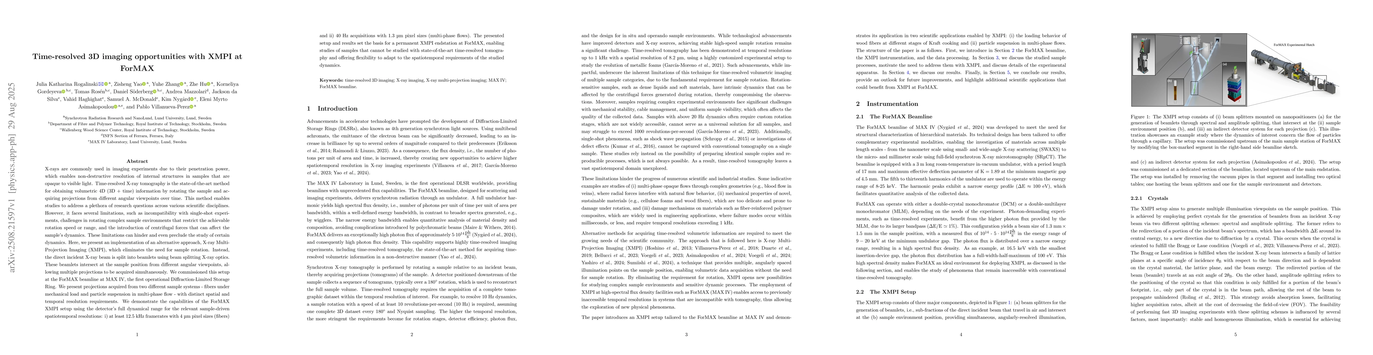 X-rays are commonly used in imaging experiments due to their penetration power, which enables non-destructive resolution of internal structures in samples that are opaque to visible light. Time-resolved X-ray tomography is the state-of-the-art method for obtaining volumetric 4D (3D + time) information by rotating the sample and acquiring projections from different angular viewpoints over time. This method enables studies to address a plethora of research questions across various scientific disciplines. However, it faces several limitations, such as incompatibility with single-shot experiments, challenges in rotating complex sample environments that restrict the achievable rotation speed or range, and the introduction of centrifugal forces that can affect the sample's dynamics. These limitations can hinder and even preclude the study of certain dynamics. Here, we present an implementation of an alternative approach, X-ray Multi-Projection Imaging (XMPI), which eliminates the need for sample rotation. Instead, the direct incident X-ray beam is split into beamlets using beam splitting X-ray optics. These beamlets intersect at the sample position from different angular viewpoints, allowing multiple projections to be acquired simultaneously. We commissioned this setup at the ForMAX beamline at MAX IV. We present projections acquired from two different sample systems - fibers under mechanical load and particle suspension in multi-phase flow - with distinct spatial and temporal resolution requirements. We demonstrate the capabilities of the ForMAX XMPI setup using the detector's full dynamical range for the relevant sample-driven spatiotemporal resolutions: i) at least 12.5 kHz framerates with 4 micrometer pixel sizes (fibers) and ii) 40 Hz acquisitions with 1.3 micrometer pixel sizes (multi-phase flows), setting the basis for a permanent XMPI endstation at ForMAX.