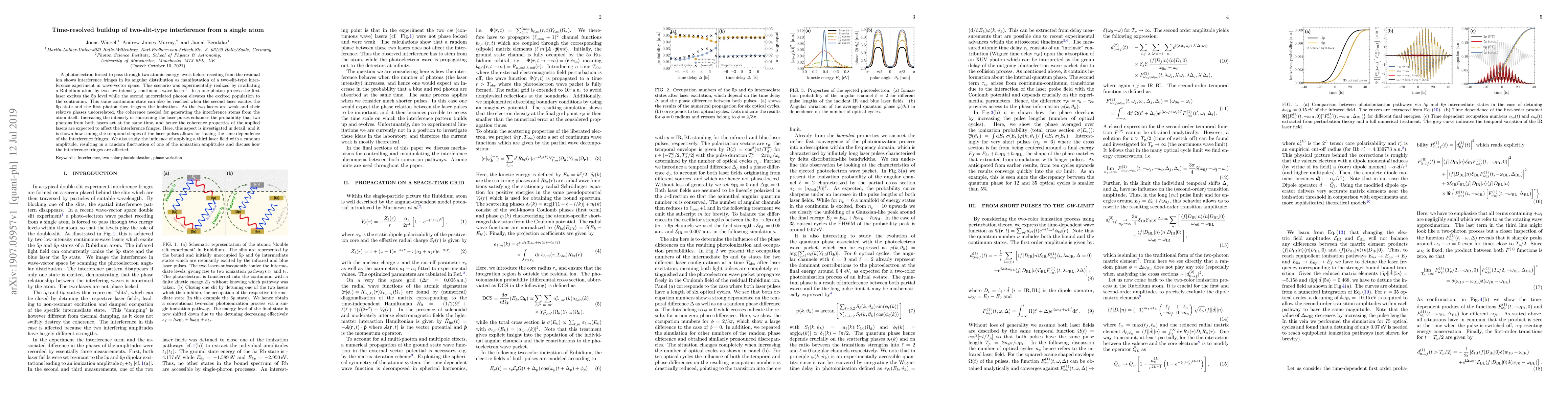 A photoelectron forced to pass through two atomic energy levels before receding from the residual ion shows interference fringes in its angular distribution as manifestation of a two-slit-type interference experiment in wave-vector space. This scenario was experimentally realized by irradiating a Rubidium atom by two low-intensity continuous-wave lasers [Pursehouse et al., Phys. Rev. Lett. 122, 053204 (2019)]. In a one-photon process the first laser excites the 5p level while the second uncorrelated photon elevates the excited population to the continuum. This same continuum state can also be reached when the second laser excites the 6p state and the first photon then triggers the ionization. As the two lasers are weak and their relative phases uncorrelated, the coherence needed for generating the interference stems from the atom itself. Increasing the intensity or shortening the laser pulses enhances the probability that two photons from both lasers act at the same time, and hence the coherence properties of the applied lasers are expected to affect the interference fringes. Here, this aspect is investigated in detail, and it is shown how tuning the temporal shapes of the laser pulses allows for tracing the time-dependence of the interference fringes. We also study the influence of applying a third laser field with a random amplitude, resulting in a random fluctuation of one of the ionization amplitudes and discuss how the interference fringes are affected.