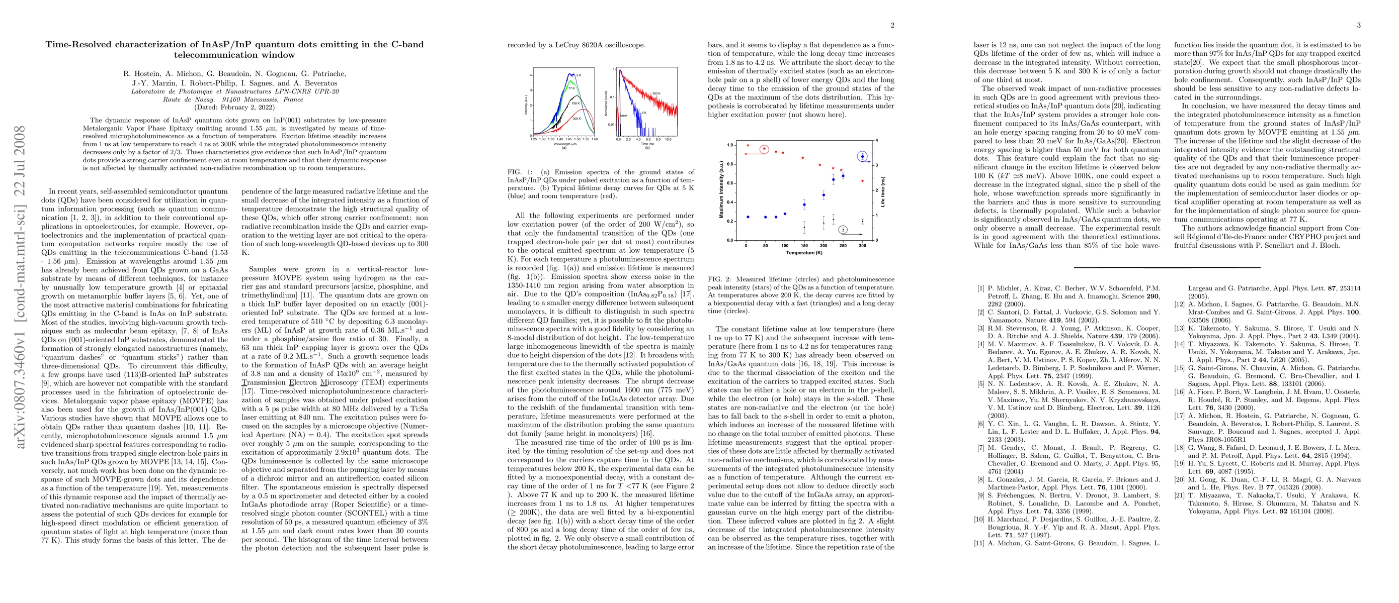 This study investigates InAsP quantum dots on InP substrates, revealing a steady increase in exciton lifetime from 1 ns at low temperatures to 4 ns at 300K, while photoluminescence intensity drops by only 2/3. These findings suggest strong carrier confinement and minimal impact from non-radiative recombination up to room temperature.