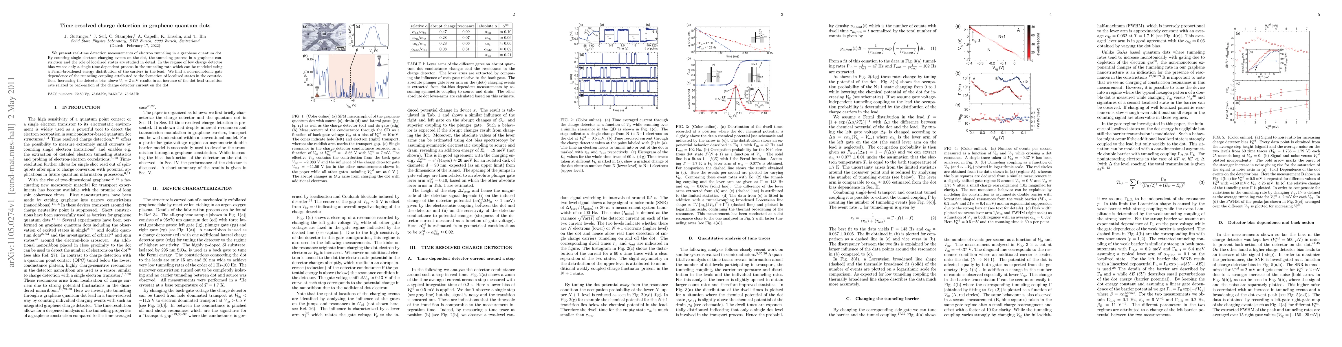 This paper investigates real-time electron tunneling in graphene quantum dots, revealing a single time-dependent tunneling process modeled by a Fermi-broadened energy distribution. It finds a non-monotonic gate dependence due to localized states, with increased dot-lead transition rates at higher detector biases.