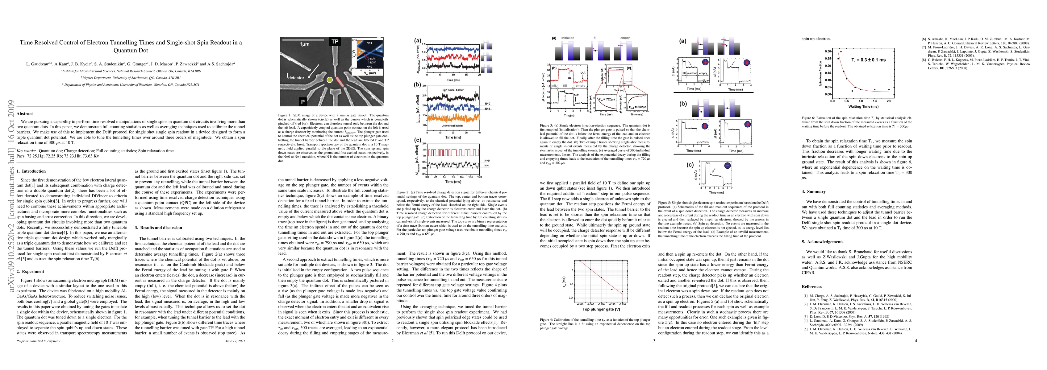 This paper demonstrates time-resolved manipulation of single spins in quantum dot circuits, achieving full counting statistics and calibration of tunnel barriers. The Delft protocol enables single-shot spin readout in a triple quantum dot device, with tunnelling times tuned over three orders of magnitude and a spin relaxation time of 300 microseconds at 10 Tesla.