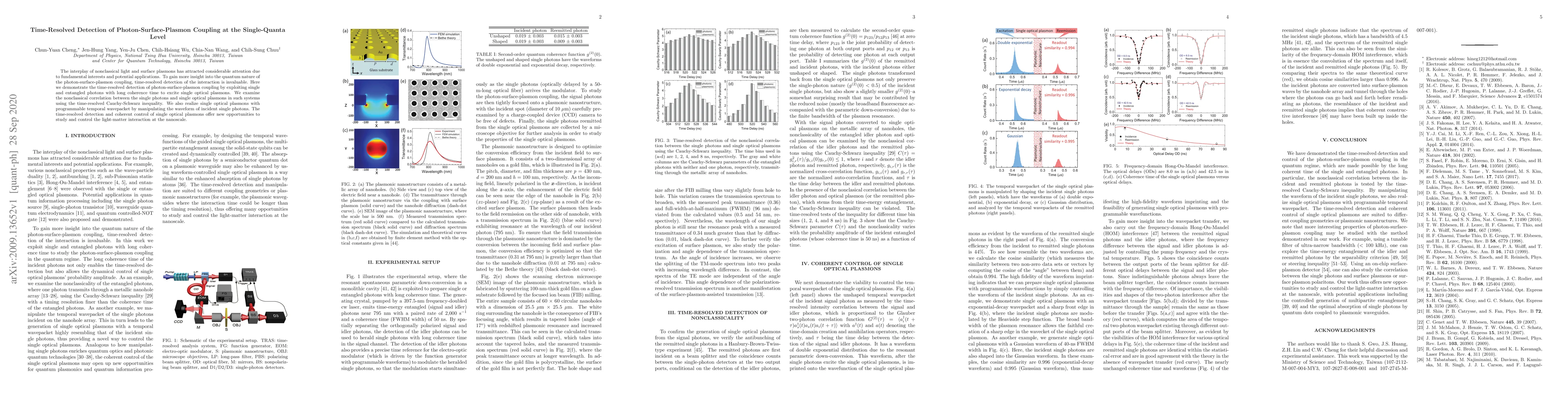 This paper demonstrates time-resolved detection of photon-surface-plasmon coupling at the single-quanta level using single and entangled photons, revealing nonclassical correlations and enabling programmable temporal wavepackets for single optical plasmons. This approach provides new insights into light-matter interactions at the nanoscale.