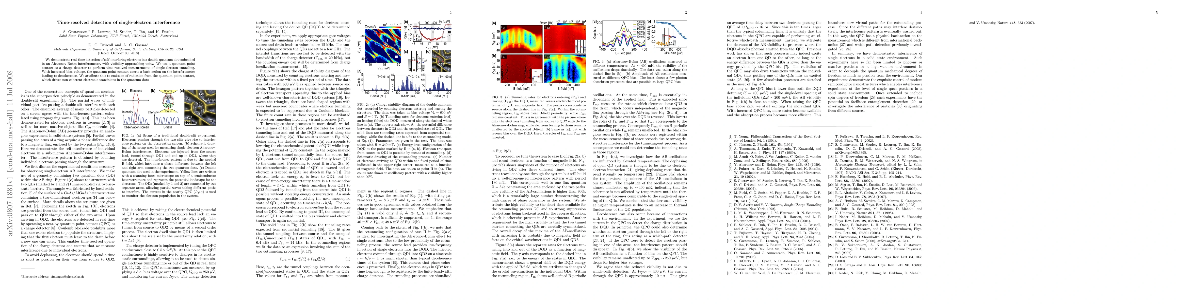 We demonstrate real-time detection of self-interfering electrons in a double quantum dot embedded in an Aharonov-Bohm interferometer, with visibility approaching unity. We use a quantum point contact as a charge detector to perform time-resolved measurements of single-electron tunneling. With increased bias voltage, the quantum point contact exerts a back-action on the interferometer leading to decoherence. We attribute this to emission of radiation from the quantum point contact, which drives non-coherent electronic transitions in the quantum dots.