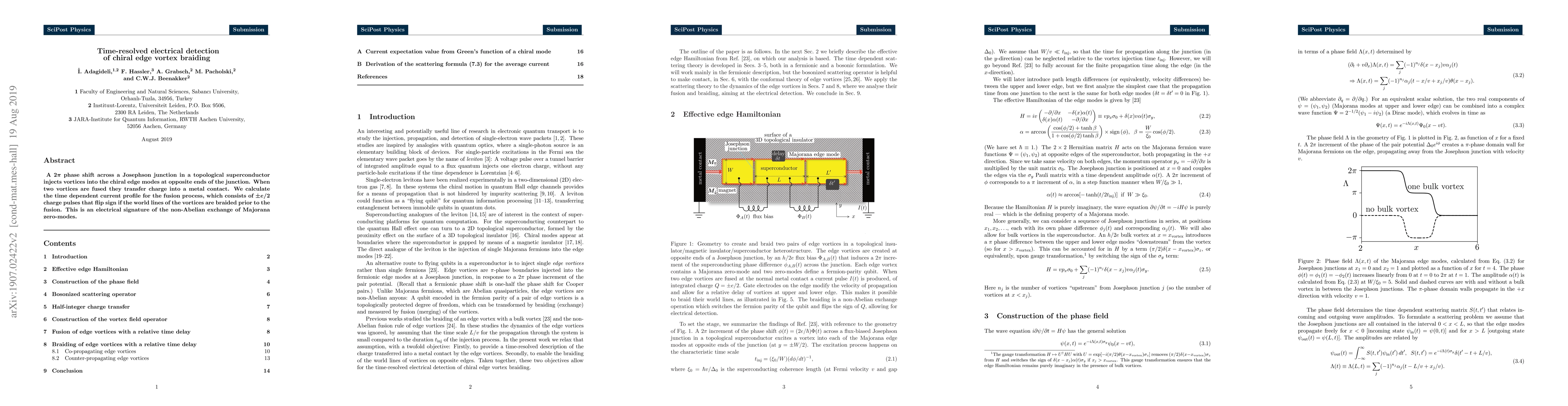 This paper investigates the time-resolved electrical detection of chiral edge vortex braiding in topological superconductors, revealing $\pm e/2$ charge pulses during vortex fusion, which signify the non-Abelian exchange of Majorana zero-modes. The study provides an electrical signature of vortex braiding through phase shifts across a Josephson junction.