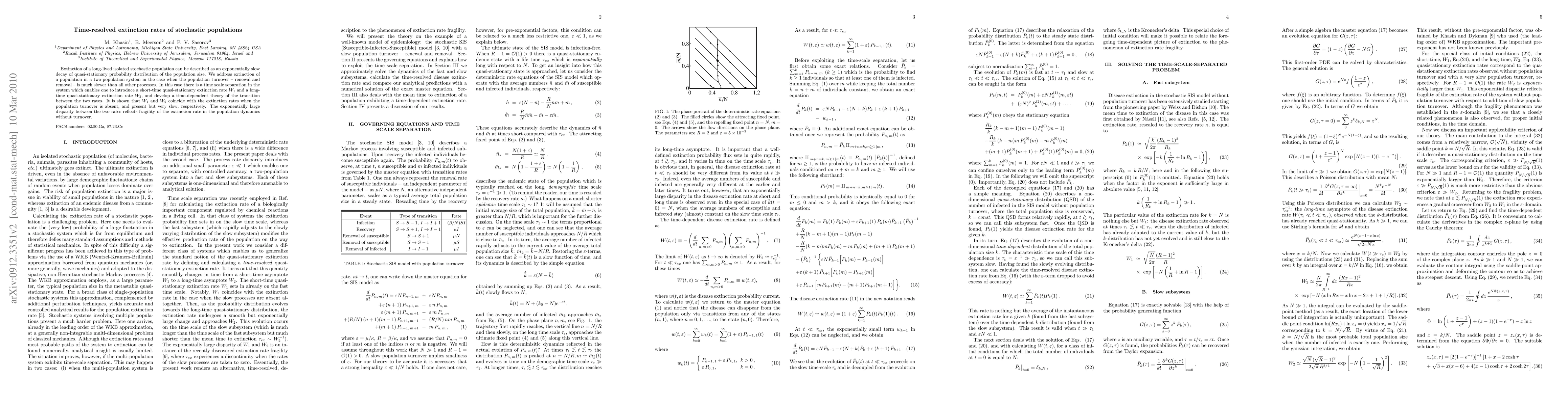 Extinction of a long-lived isolated stochastic population can be described as an exponentially slow decay of quasi-stationary probability distribution of the population size. We address extinction of a population in a two-population system in the case when the population turnover -- renewal and removal -- is much slower than all other processes. In this case there is a time scale separation in the system which enables one to introduce a short-time quasi-stationary extinction rate W_1 and a long-time quasi-stationary extinction rate W_2, and develop a time-dependent theory of the transition between the two rates. It is shown that W_1 and W_2 coincide with the extinction rates when the population turnover is absent, and present but very slow, respectively. The exponentially large disparity between the two rates reflects fragility of the extinction rate in the population dynamics without turnover.