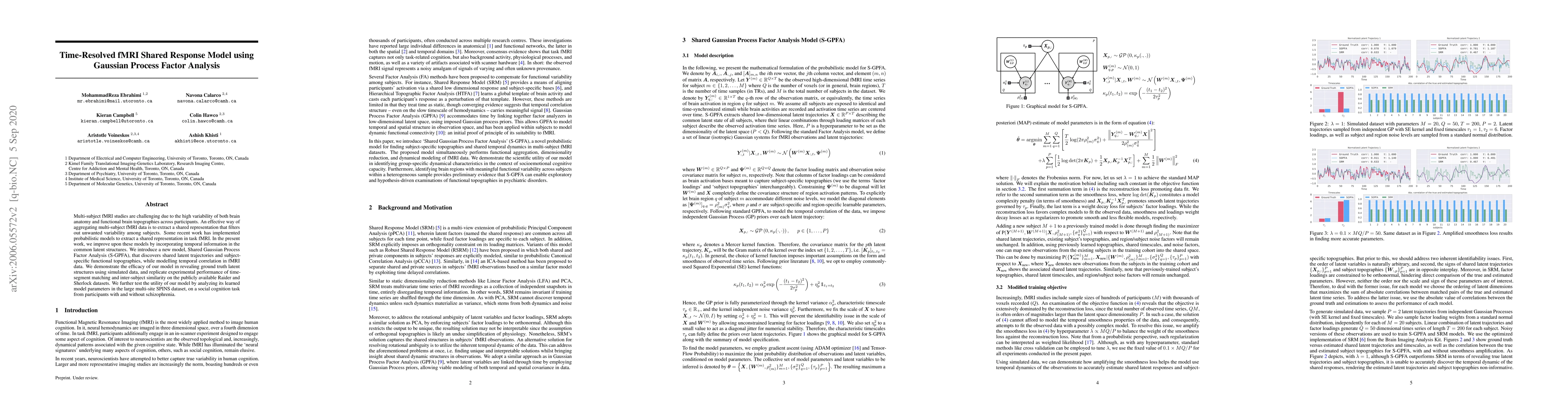 Multi-subject fMRI studies are challenging due to the high variability of both brain anatomy and functional brain topographies across participants. An effective way of aggregating multi-subject fMRI data is to extract a shared representation that filters out unwanted variability among subjects. Some recent work has implemented probabilistic models to extract a shared representation in task fMRI. In the present work, we improve upon these models by incorporating temporal information in the common latent structures. We introduce a new model, Shared Gaussian Process Factor Analysis (S-GPFA), that discovers shared latent trajectories and subject-specific functional topographies, while modelling temporal correlation in fMRI data. We demonstrate the efficacy of our model in revealing ground truth latent structures using simulated data, and replicate experimental performance of time-segment matching and inter-subject similarity on the publicly available Raider and Sherlock datasets. We further test the utility of our model by analyzing its learned model parameters in the large multi-site SPINS dataset, on a social cognition task from participants with and without schizophrenia.