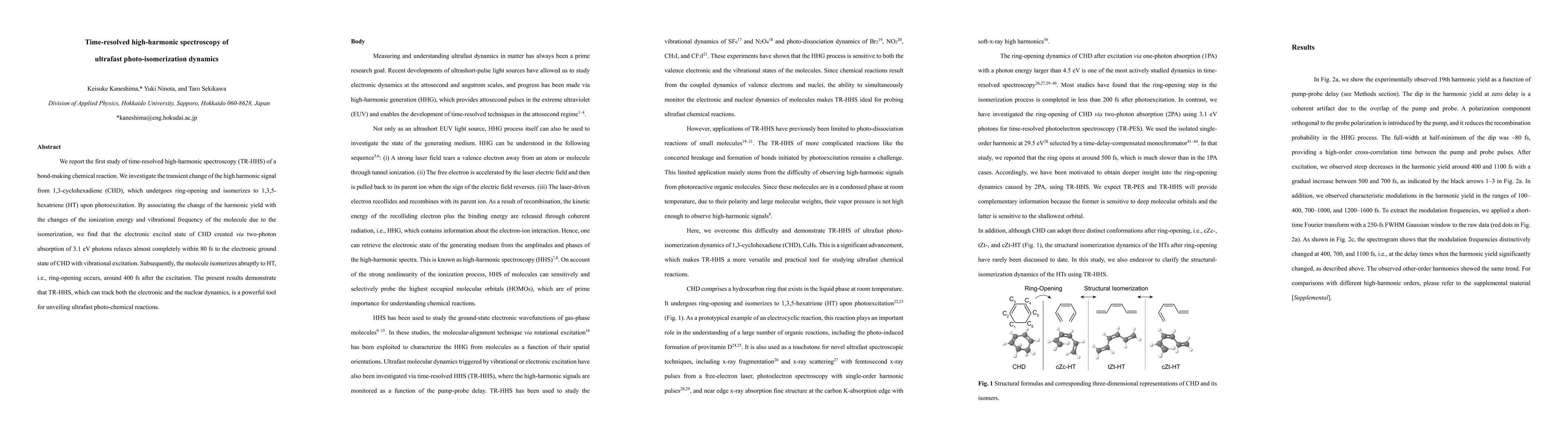 This study uses time-resolved high-harmonic spectroscopy (TR-HHS) to track the ultrafast photo-isomerization dynamics of 1,3-cyclohexadiene (CHD) to 1,3,5-hexatriene (HT). The results reveal that CHD rapidly relaxes to its ground state within 80 fs, followed by an abrupt ring-opening isomerization to HT around 400 fs, demonstrating TR-HHS as a powerful tool for studying ultrafast photo-chemical reactions.