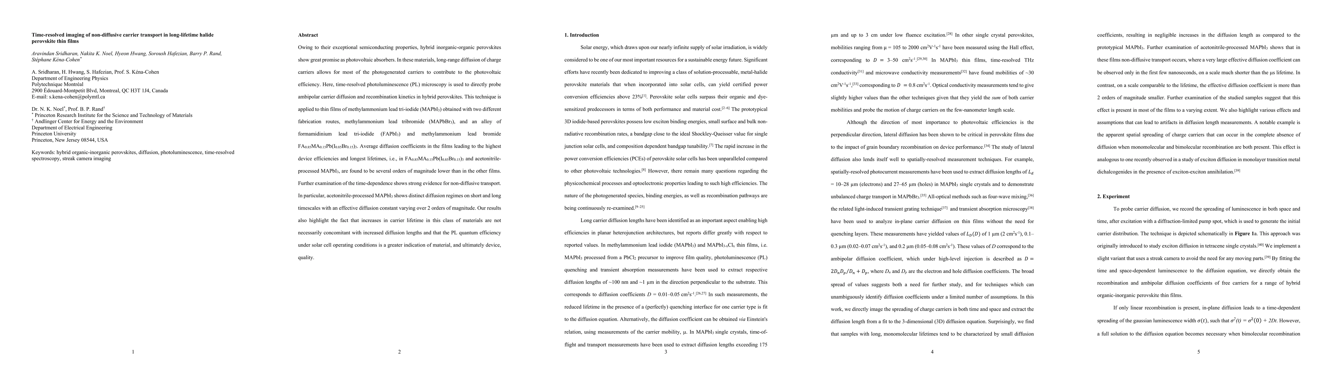 Researchers used time-resolved photoluminescence microscopy to study carrier transport in long-lifetime halide perovskite thin films, finding non-diffusive transport and a link between carrier lifetime and device quality.