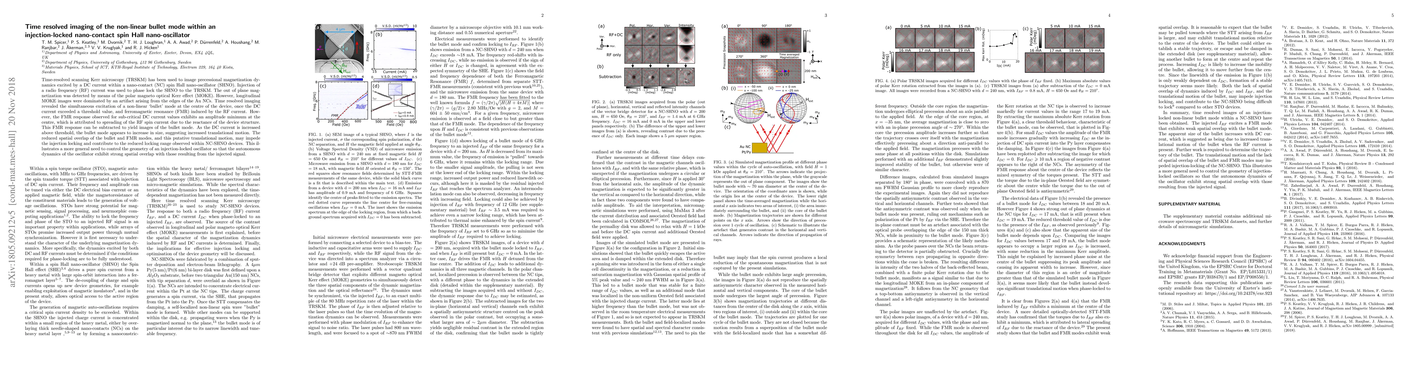 Injection of a radio frequency (RF) current was used to phase lock the SHNO to the TRSKM. The out of plane magnetization was detected by means of the polar magneto optical Kerr effect (MOKE). However, longitudinal MOKE images were dominated by an artifact arising from the edges of the Au NCs. Time resolved imaging revealed the simultaneous excitation of a non-linear `bullet' mode at the centre of the device, once the DC current exceeded a threshold value, and ferromagnetic resonance (FMR) induced by the RF current. However, the FMR response observed for sub-critical DC current values exhibits an amplitude minimum at the centre, which is attributed to spreading of the RF spin current due to the reactance of the device structure. This FMR response can be subtracted to yield images of the bullet mode. As the DC current is increased above threshold, the bullet mode appears to increase in size, suggesting increased translational motion. The reduced spatial overlap of the bullet and FMR modes, and this putative translational motion, may impede the injection locking and contribute to the reduced locking range observed within NC-SHNO devices. This illustrates a more general need to control the geometry of an injection-locked oscillator so that the autonomous dynamics of the oscillator exhibit strong spatial overlap with those resulting from the injected signal.