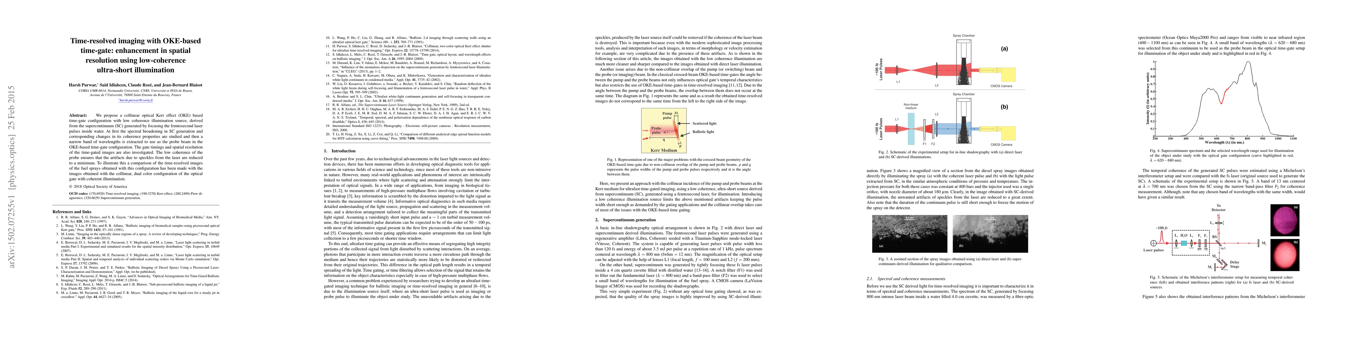 This paper proposes a collinear optical Kerr effect (OKE) based time-gate technique using low-coherence illumination from a supercontinuum generated by femtosecond laser pulses in water. The method enhances spatial resolution by minimizing speckle artifacts, demonstrated through improved imaging of fuel sprays compared to a dual-color coherent illumination setup.