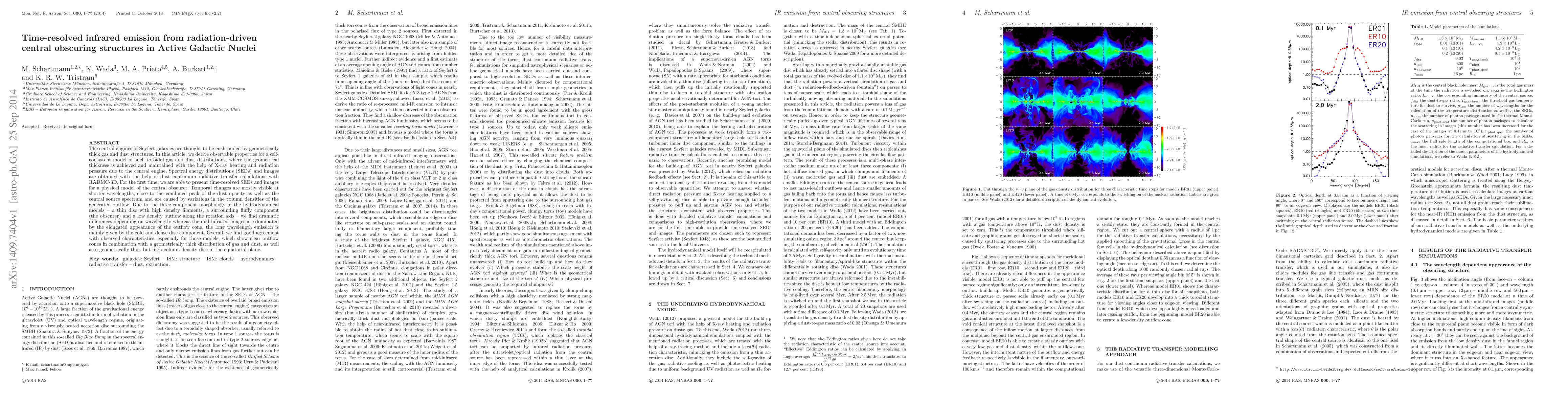 The central engines of Seyfert galaxies are thought to be enshrouded by geometrically thick gas and dust structures. In this article, we derive observable properties for a self-consistent model of such toroidal gas and dust distributions, where the geometrical thickness is achieved and maintained with the help of X-ray heating and radiation pressure due to the central engine. Spectral energy distributions (SEDs) and images are obtained with the help of dust continuum radiative transfer calculations with RADMC-3D. For the first time, we are able to present time-resolved SEDs and images for a physical model of the central obscurer. Temporal changes are mostly visible at shorter wavelengths, close to the combined peak of the dust opacity as well as the central source spectrum and are caused by variations in the column densities of the generated outflow. Due to the three-component morphology of the hydrodynamical models -- a thin disc with high density filaments, a surrounding fluffy component (the obscurer) and a low density outflow along the rotation axis -- we find dramatic differences depending on wavelength: whereas the mid-infrared images are dominated by the elongated appearance of the outflow cone, the long wavelength emission is mainly given by the cold and dense disc component. Overall, we find good agreement with observed characteristics, especially for those models, which show clear outflow cones in combination with a geometrically thick distribution of gas and dust, as well as a geometrically thin, but high column density disc in the equatorial plane.
