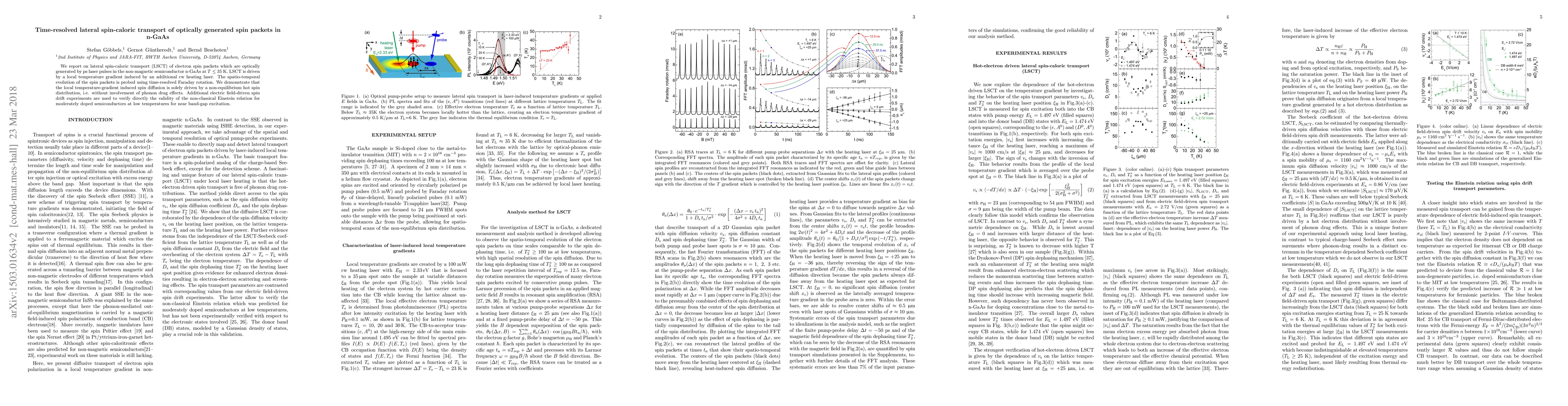 We report on lateral spin-caloric transport (LSCT) of electron spin packets which are optically generated by ps laser pulses in the non-magnetic semiconductor n-GaAs at $T\leq35$K. LSCT is driven by a local temperature gradient induced by an additional cw heating laser. The spatio-temporal evolution of the spin packets is probed using time-resolved Faraday rotation. We demonstrate that the local temperature-gradient induced spin diffusion is solely driven by a non-equilibrium hot spin distribution, i.e. without involvement of phonon drag effects. Additional electric field-driven spin drift experiments are used to verify directly the validity of the non-classical Einstein relation for moderately doped semiconductors at low temperatures for near band-gap excitation.