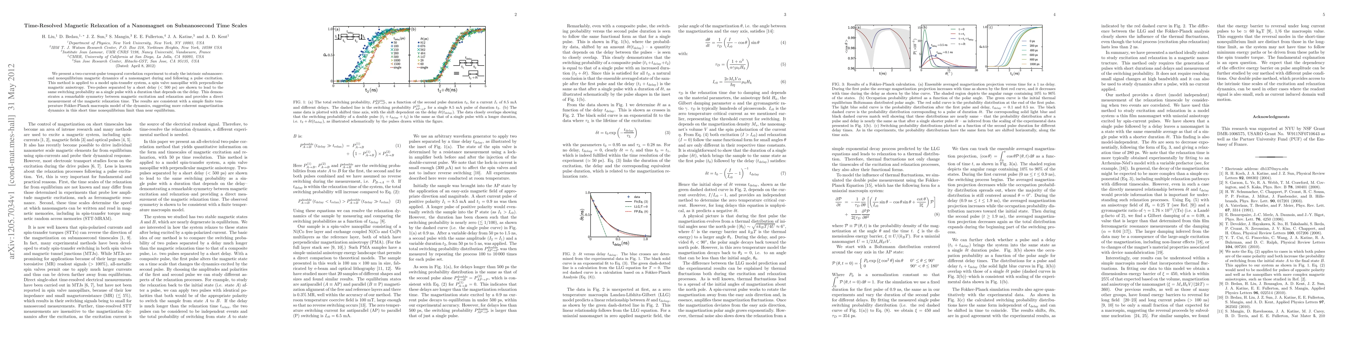 We present a two-current-pulse temporal correlation experiment to study the intrinsic subnanosecond nonequilibrium magnetic dynamics of a nanomagnet during and following a pulse excitation. This method is applied to a model spin-transfer system, a spin valve nanopillar with perpendicular magnetic anisotropy. Two-pulses separated by a short delay (< 500 ps) are shown to lead to the same switching probability as a single pulse with a duration that depends on the delay. This demonstrates a remarkable symmetry between magnetic excitation and relaxation and provides a direct measurement of the magnetic relaxation time. The results are consistent with a simple finite temperature Fokker-Planck macrospin model of the dynamics, suggesting more coherent magnetization dynamics in this short time nonequilibrium limit than near equilibrium.
