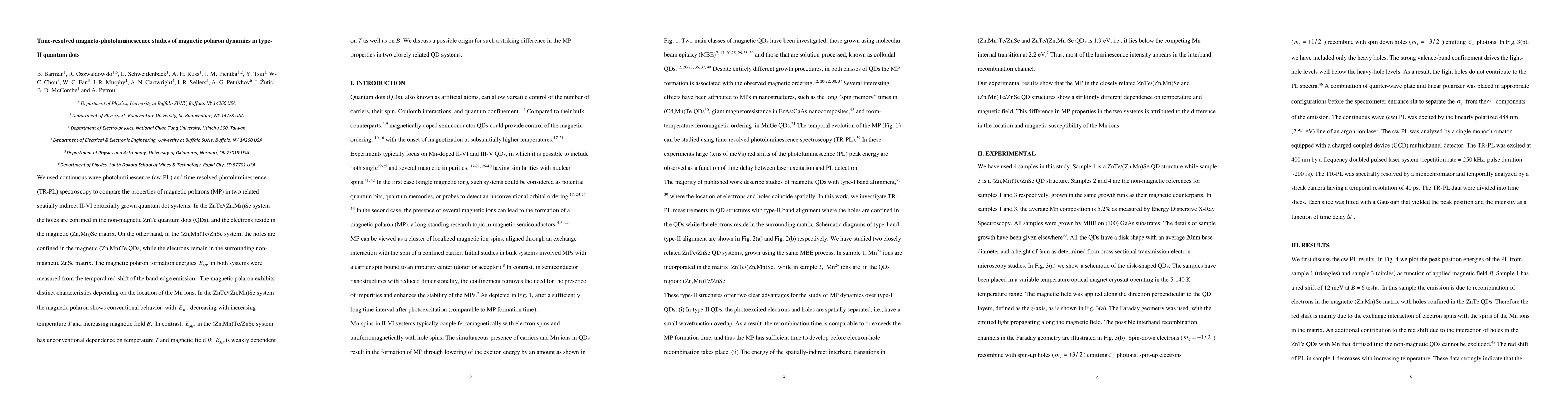 We used continuous wave photoluminescence (cw-PL) and time resolved photoluminescence (TR-PL) spectroscopy to compare the properties of magnetic polarons (MP) in two related spatially indirect II-VI epitaxially grown quantum dot systems. In the ZnTe/(Zn,Mn)Se system the holes are confined in the non-magnetic ZnTe quantum dots (QDs), and the electrons reside in the magnetic (Zn,Mn)Se matrix. On the other hand, in the (Zn,Mn)Te/ZnSe system, the holes are confined in the magnetic (Zn,Mn)Te QDs, while the electrons remain in the surrounding non-magnetic ZnSe matrix. The magnetic polaron formation energies in both systems were measured from the temporal red-shift of the band-edge emission. The magnetic polaron exhibits distinct characteristics depending on the location of the Mn ions. In the ZnTe/(Zn,Mn)Se system the magnetic polaron shows conventional behavior with decreasing with increasing temperature T and increasing magnetic field B. In contrast, in the (Zn,Mn)Te/ZnSe system has unconventional dependence on temperature T and magnetic field B; is weakly dependent on T as well as on B. We discuss a possible origin for such a striking difference in the MP properties in two closely related QD systems.