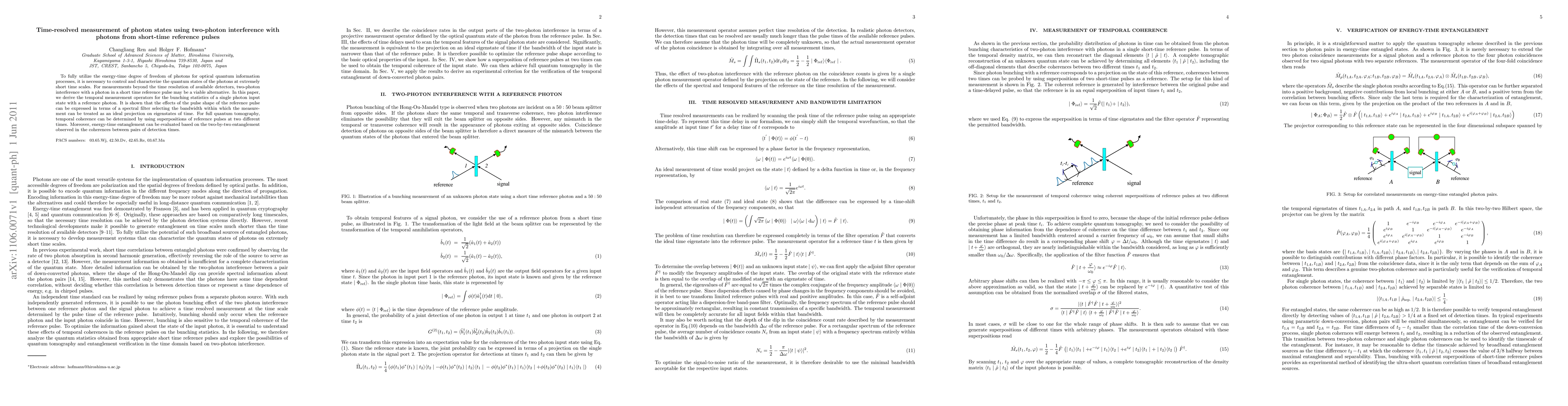 The paper describes a method for time-resolved measurement of photon states using two-photon interference with photons from short-time reference pulses, involving projective measurement operators defined by the optical quantum state of a reference photon and considering time delays to scan the temporal features of the signal photon state.