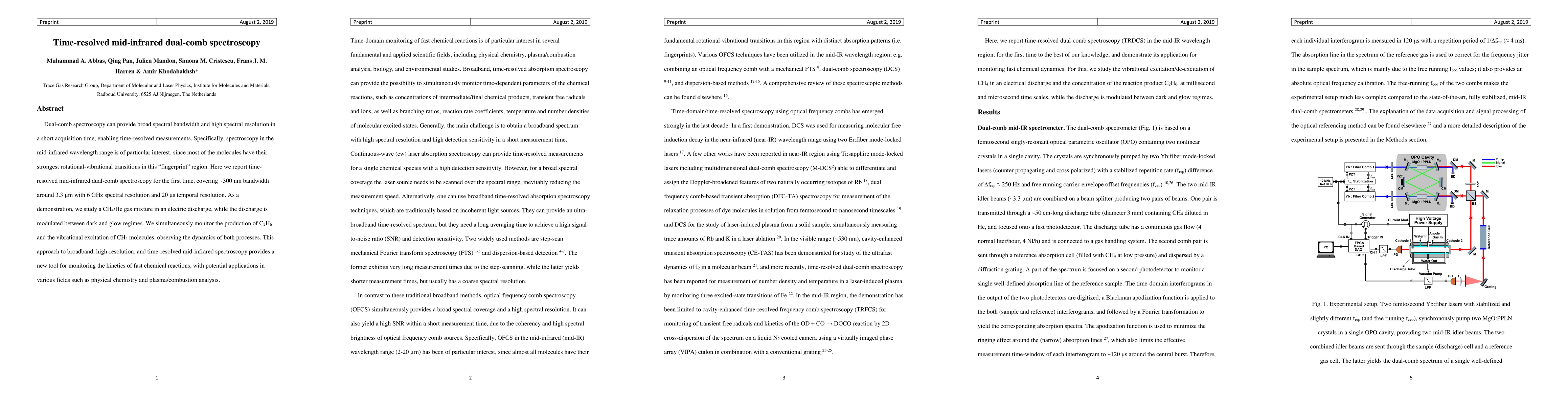 This paper presents the first time-resolved mid-infrared dual-comb spectroscopy, achieving a ~300 nm bandwidth around 3.3 μm with high spectral and temporal resolution, enabling monitoring of fast chemical reactions like the production of C2H6 and vibrational excitation in CH4 during an electric discharge.