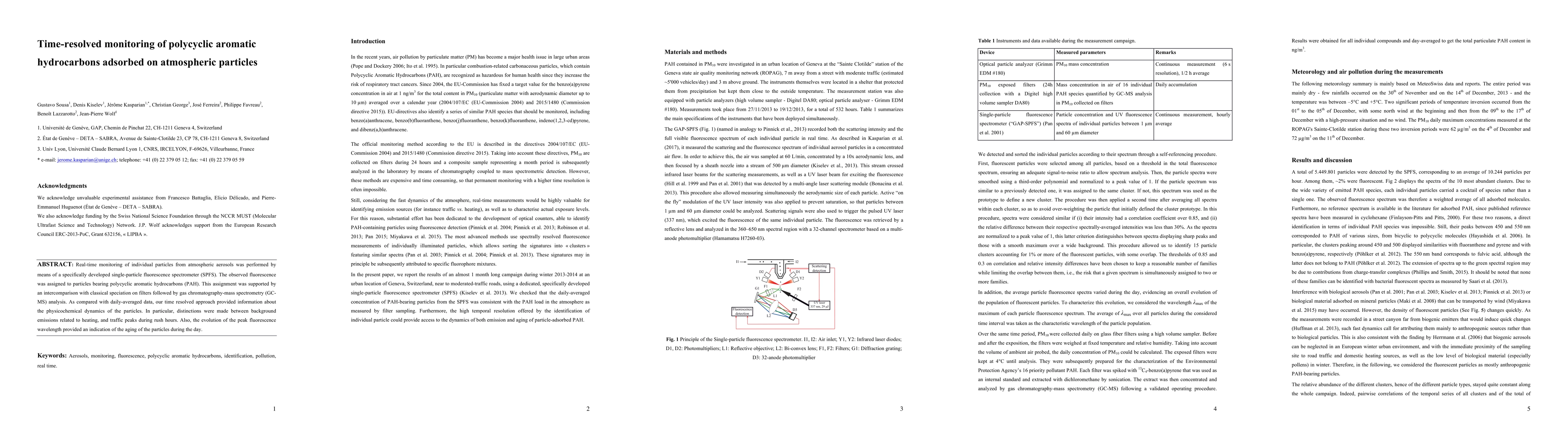 This paper presents a novel single-particle fluorescence spectrometer (SPFS) to monitor polycyclic aromatic hydrocarbons (PAH) on atmospheric particles in real-time, revealing dynamic changes in particle composition and aging, distinguishing between background emissions and traffic-related peaks. The findings complement traditional GC-MS analysis for more detailed temporal insights.