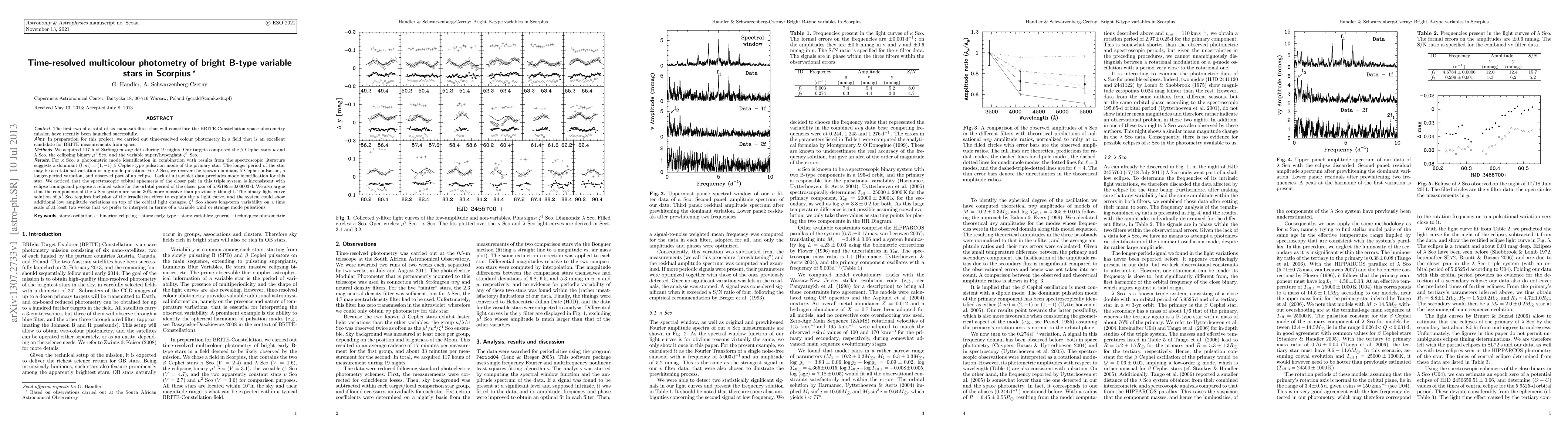 The first two of a total of six nano-satellites that will constitute the BRITE-Constellation space photometry mission have recently been launched successfully. In preparation for this project, we carried out time-resolved colour photometry in a field that is an excellent candidate for BRITE measurements from space. We acquired 117 h of Stromgren uvy data during 19 nights. Our targets comprised the Beta Cephei stars Kappa and Lambda Sco, the eclipsing binary Mu 1 Sco, and the variable super/hypergiant Zeta 1 Sco. For Kappa Sco, a photometric mode identification in combination with results from the spectroscopic literature suggests a dominant (l, m) = (1, -1) Beta Cephei-type pulsation mode of the primary star. The longer period of the star may be a rotational variation or a g-mode pulsation. For Lambda Sco, we recover the known dominant Beta Cephei pulsation, a longer-period variation, and observed part of an eclipse. Lack of ultraviolet data precludes mode identification for this star. We noticed that the spectroscopic orbital ephemeris of the closer pair in this triple system is inconsistent with eclipse timings and propose a refined value for the orbital period of the closer pair of 5.95189 +/- 0.00003 d. We also argue that the components of the Lambda Sco system are some 30% more massive than previously thought. The binary light curve solution of Mu 1 Sco requires inclusion of the irradiation effect to explain the u light curve, and the system could show additional low amplitude variations on top of the orbital light changes. Zeta 1 Sco shows long-term variability on a time scale of at least two weeks that we prefer to interpret in terms of a variable wind or strange mode pulsations.