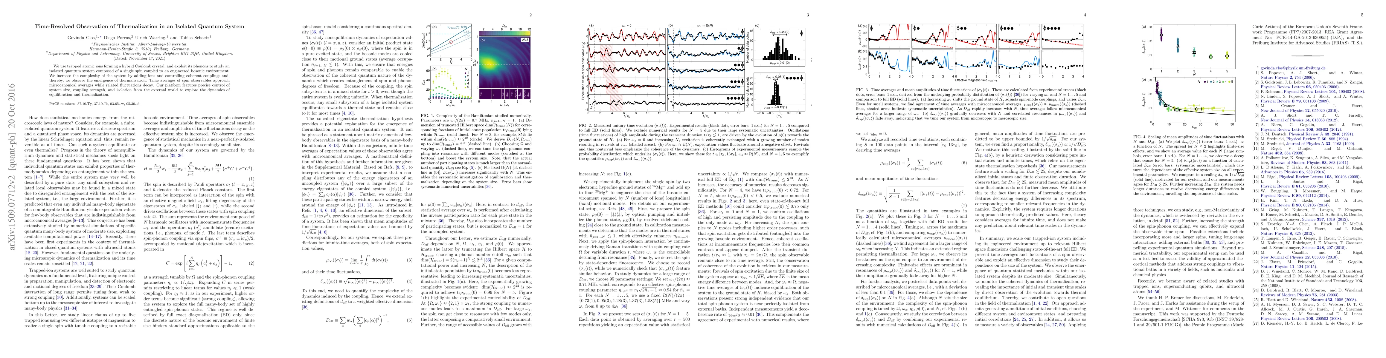 This research investigates thermalization in an isolated quantum system using trapped atomic ions and phonons, observing the convergence of time averages of spin observables to microcanonical averages and the decay of related fluctuations. The study highlights the dynamics of equilibration and thermalization under precise control of system size and coupling.