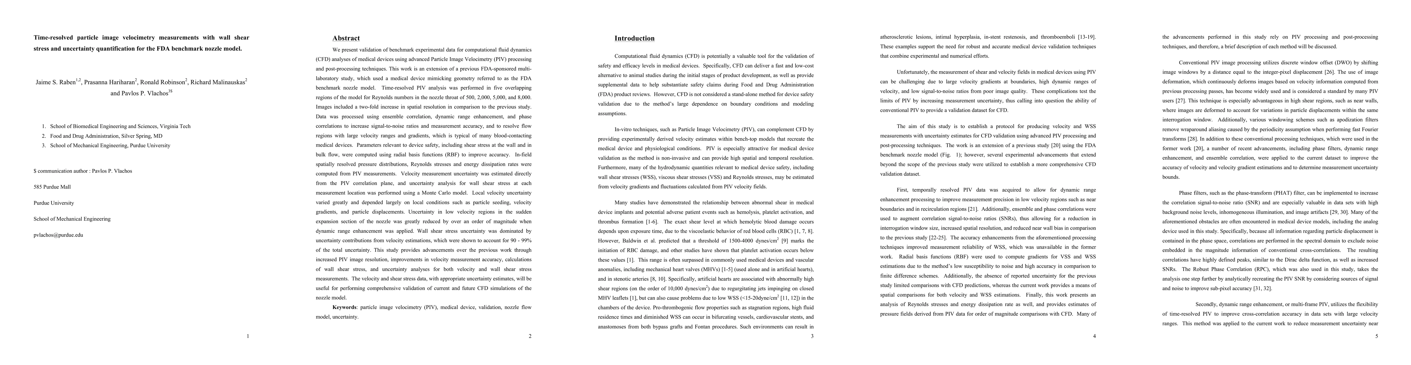 This study validates CFD analyses for medical devices using advanced PIV techniques, analyzing flow in the FDA benchmark nozzle model at various Reynolds numbers. Enhanced PIV processing and uncertainty quantification methods were employed to improve measurement accuracy and resolve complex flow regions.