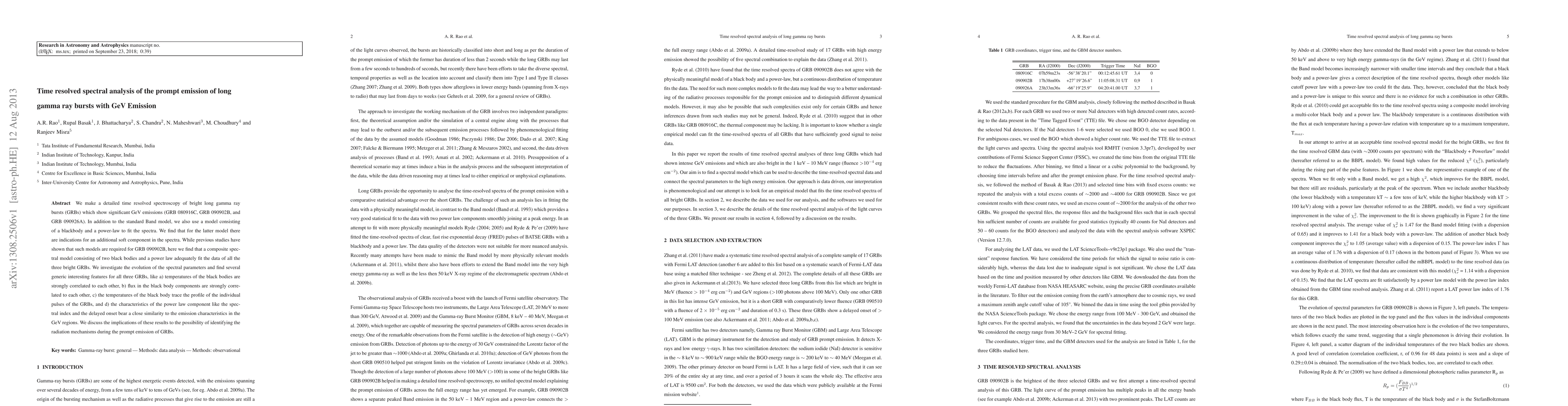 We make a detailed time resolved spectroscopy of bright long gamma ray bursts (GRBs) which show significant GeV emissions (GRB 080916C, GRB 090902B, and GRB 090926A). In addition to the standard Band model, we also use a model consisting of a blackbody and a power-law to fit the spectra. We find that for the latter model there are indications for an additional soft component in the spectra. While previous studies have shown that such models are required for GRB 090902B, here we find that a composite spectral model consisting of two black bodies and a power law adequately fit the data of all the three bright GRBs. We investigate the evolution of the spectral parameters and find several generic interesting features for all three GRBs, like a) temperatures of the black bodies are strongly correlated to each other, b) flux in the black body components are strongly correlated to each other, c) the temperatures of the black body trace the profile of the individual pulses of the GRBs, and d) the characteristics of the power law component like the spectral index and the delayed onset bear a close similarity to the emission characteristics in the GeV regions. We discuss the implications of these results to the possibility of identifying the radiation mechanisms during the prompt emission of GRBs.