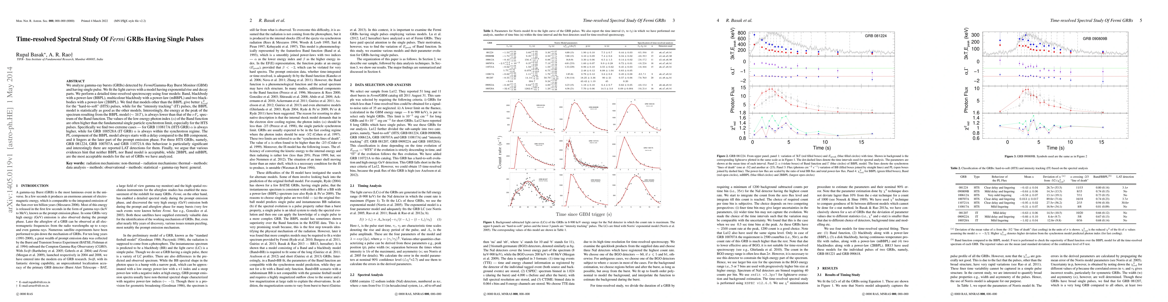 We analyze gamma-ray bursts (GRBs) detected by \textit{Fermi}/Gamma-Ray Burst Monitor (GBM) and having single pulse. We fit the light curves with a model having exponential rise and decay parts. We perform a detailed time-resolved spectroscopy using four models: Band, blackbody with a power-law (BBPL), multicolour blackbody with a power-law (mBBPL) and two blackbodies with a power-law (2BBPL). We find that models other than the BBPL give better $\chi_{red}^2$ for the "hard-to-soft" (HTS) pulses, while for the "intensity tracking" (IT) pulses, the BBPL model is statistically as good as the other models. Interestingly, the energy at the peak of the spectrum resulting from the BBPL model ($\sim3kT$), is always lower than that of the $\nu F_{\nu}$ spectrum of the Band function. The values of the low energy photon index ($\alpha$) of the Band function are often higher than the fundamental single particle synchrotron limit, especially for the HTS pulses. Specifically we find two extreme cases --- for GRB~110817A (HTS GRB) $\alpha$ is always higher, while for GRB~100528A (IT GRB) $\alpha$ is always within the synchrotron regime. The PL component of the BBPL model always starts with a delay compared to the BB component, and it lingers at the later part of the prompt emission phase. For three HTS GRBs, namely, GRB~081224, GRB~100707A and GRB~110721A this behaviour is particularly significant and interestingly there are reported LAT detections for them. Finally, we argue that various evidences hint that neither BBPL nor Band model is acceptable, while 2BBPL and mBBPL are the most acceptable models for the set of GRBs we have analyzed.