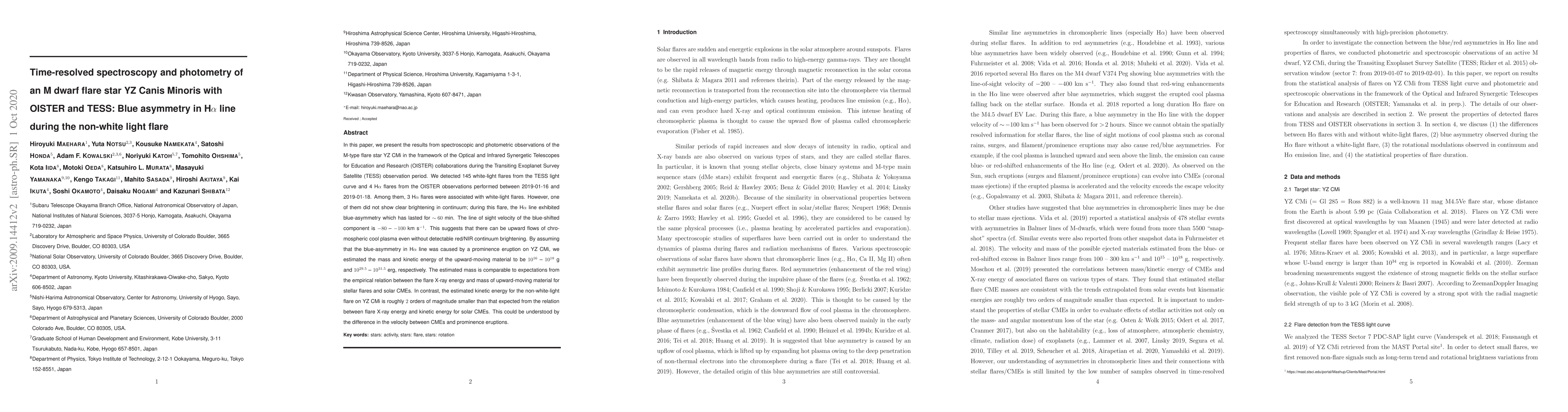 In this paper, we present the results from spectroscopic and photometric observations of the M-type flare star YZ CMi in the framework of the Optical and Infrared Synergetic Telescopes for Education and Research (OISTER) collaborations during the Transiting Exoplanet Survey Satellite (TESS) observation period. We detected 145 white-light flares from the TESS light curve and 4 H$\alpha$ flares from the OISTER observations performed between 2019-01-16 and 2019-01-18. Among them, 3 H$\alpha$ flares were associated with white-light flares. However, one of them did not show clear brightening in continuum; during this flare, the H$\alpha$ line exhibited blue-asymmetry which has lasted for $\sim 60$ min. The line of sight velocity of the blue-shifted component is $-80$ - $-100$ km s$^{-1}$. This suggests that there can be upward flows of chromospheric cool plasma even without detectable red/NIR continuum brightening. By assuming that the blue-asymmetry in H$\alpha$ line was caused by a prominence eruption on YZ CMi, we estimated the mass and kinetic energy of the upward-moving material to be $10^{16}$ - $10^{18}$ g and $10^{29.5}$ - $10^{31.5}$ erg, respectively. The estimated mass is comparable to expectations from the empirical relation between the flare X-ray energy and mass of upward-moving material for stellar flares and solar CMEs. In contrast, the estimated kinetic energy for the non-white-light flare on YZ CMi is roughly $2$ orders of magnitude smaller than that expected from the relation between flare X-ray energy and kinetic energy for solar CMEs. This could be understood by the difference in the velocity between CMEs and prominence eruptions.