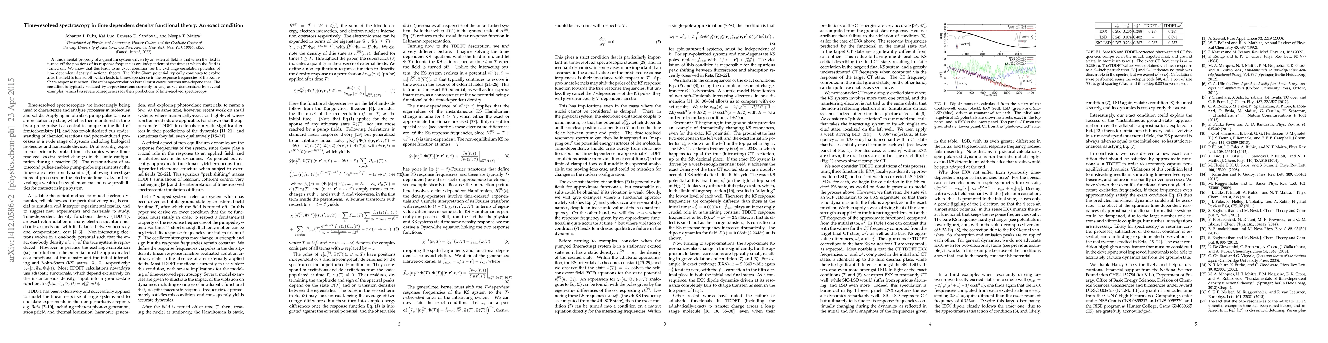 This paper establishes an exact condition for the exchange-correlation potential in time-dependent density functional theory, showing that the response frequencies of a quantum system should be independent of the time the external field is turned off. It highlights that current approximations violate this condition, leading to inaccuracies in time-resolved spectroscopy predictions.
