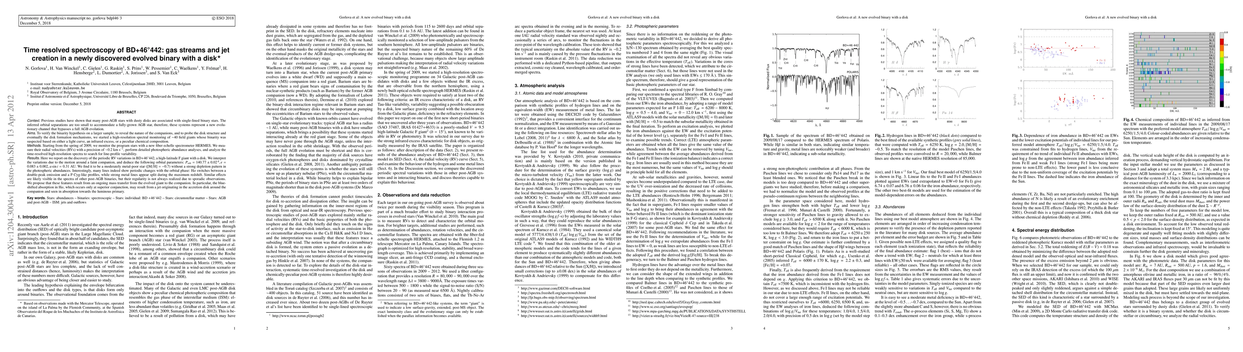 Previous studies have shown that many post-AGB stars with dusty disks are associated with single-lined binary stars. To verify the binarity hypothesis on a larger sample, we started a high-resolution spectral monitoring of about 40 field giants, whose binarity was suspected based on either a light curve, an infrared excess, or a peculiar chemical composition. Here we report on the discovery of the periodic RV variations in BD+46 442, a high-latitude F giant with a disk. We interpret the variations due to the motion around a faint companion, and deduce the following orbital parameters: Porb = 140.77 d, e = 0.083, asini=0.31 AU. We find it to be a moderately metal-poor star ([M/H]=-0.7) without a strong depletion pattern in the photospheric abundances. Interestingly, many lines show periodic changes with the orbital phase: Halpha switches between a double-peak emission and a PCyg-like profiles, while strong metal lines appear split during the maximum redshift. Similar effects are likely visible in the spectra of other post-AGB binaries, but their regularity is not always realized due to sporadic observations. We propose that these features result from an ongoing mass transfer from the evolved giant to the companion. In particular, the blue-shifted absorption in Halpha, which occurs only at superior conjunction, may result from a jet originating in the accretion disk around the companion and seen in absorption towards the luminous primary.