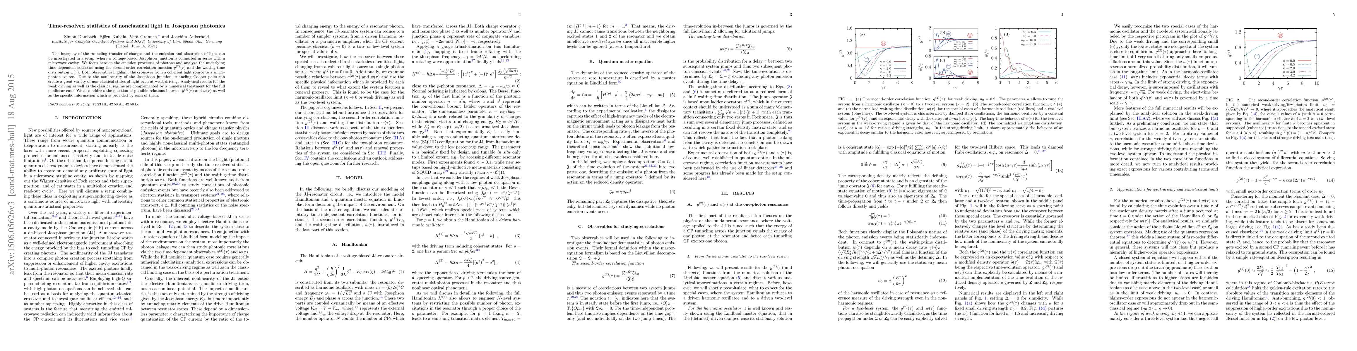 This paper investigates the time-resolved statistics of nonclassical light in Josephson photonics, focusing on photon emission processes in a voltage-biased Josephson junction connected to a microwave cavity. It uses the second-order correlation function and waiting-time distribution to analyze the transition from coherent to single-photon sources.