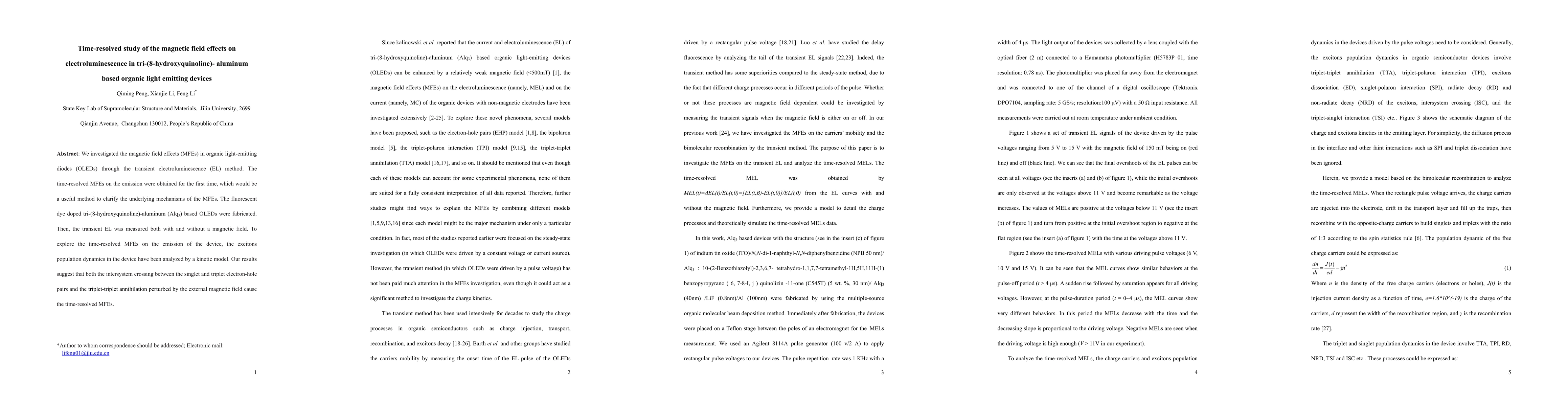 This study investigates the magnetic field effects on the transient electroluminescence in Alq3-based OLEDs, revealing the dynamics of excitons and mechanisms of magnetic field perturbations through a kinetic model. The findings suggest that both intersystem crossing and triplet-triplet annihilation are influenced by the magnetic field, providing insights into the underlying mechanisms of magnetic field effects.