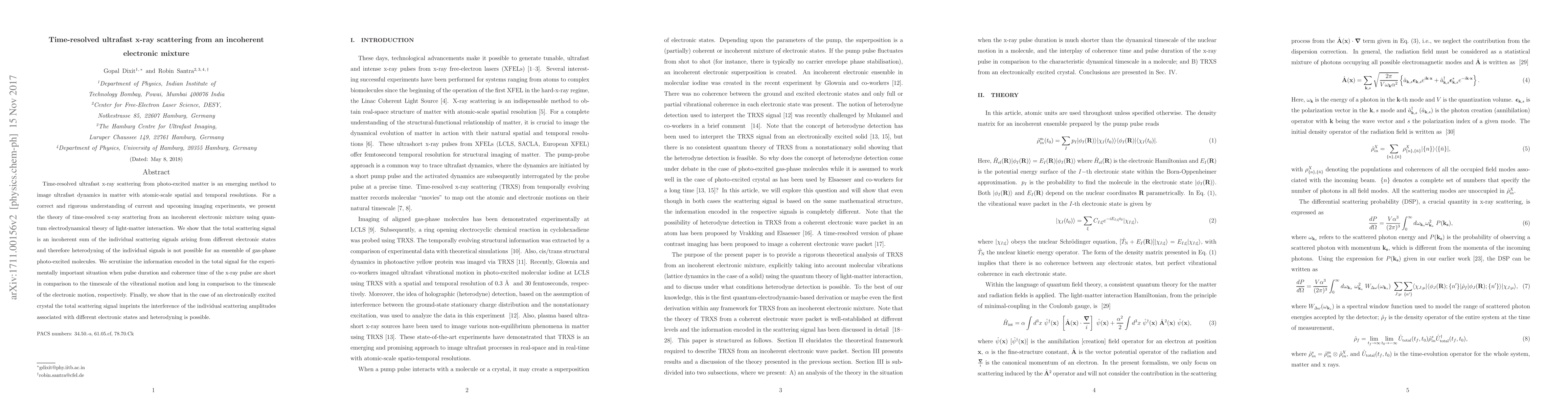 Time-resolved ultrafast x-ray scattering from photo-excited matter is an emerging method to image ultrafast dynamics in matter with atomic-scale spatial and temporal resolutions. For a correct and rigorous understanding of current and upcoming imaging experiments, we present the theory of time-resolved x-ray scattering from an incoherent electronic mixture using quantum electrodynamical theory of light-matter interaction. We show that the total scattering signal is an incoherent sum of the individual scattering signals arising from different electronic states and therefore heterodyning of the individual signals is not possible for an ensemble of gas-phase photo-excited molecules. We scrutinize the information encoded in the total signal for the experimentally important situation when pulse duration and coherence time of the x-ray pulse are short in comparison to the timescale of the vibrational motion and long in comparison to the timescale of the electronic motion, respectively. Finally, we show that in the case of an electronically excited crystal the total scattering signal imprints the interference of the individual scattering amplitudes associated with different electronic states and heterodyning is possible.