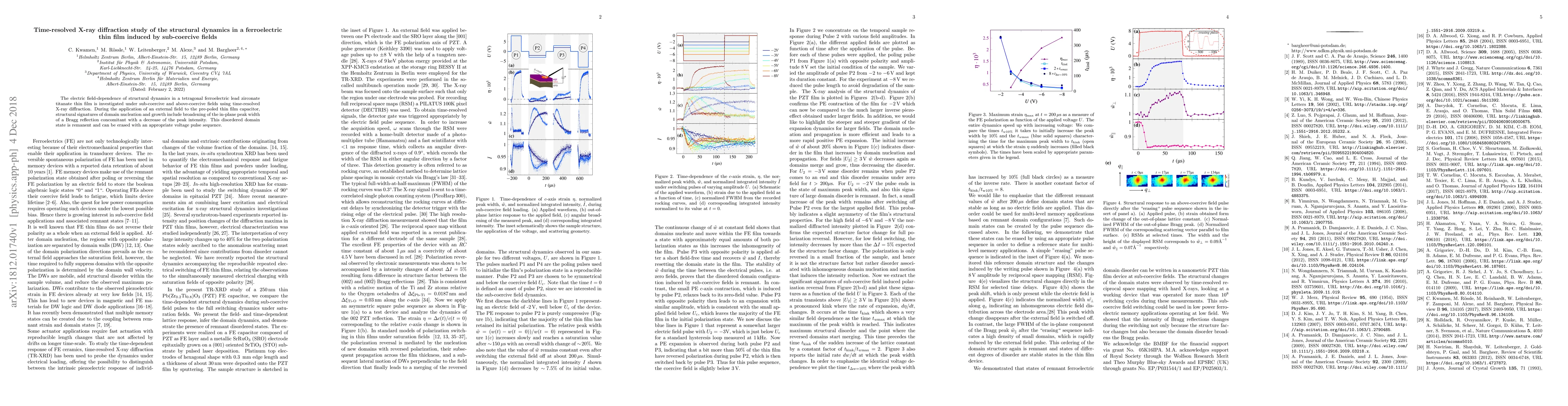 This study investigates the structural dynamics in a ferroelectric lead zirconate titanate thin film under sub-coercive fields using time-resolved X-ray diffraction, revealing domain nucleation and growth marked by peak broadening and intensity decrease, which can be erased with specific voltage pulses.