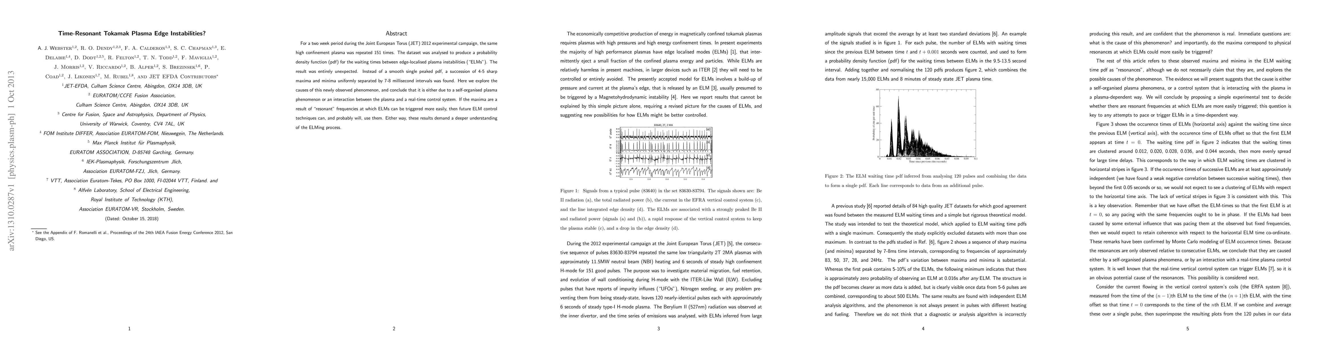 This study on the Joint European Torus (JET) found unexpected sharp maxima and minima in the waiting times between edge-localised plasma instabilities, suggesting a self-organised phenomenon or interaction with control systems. These findings could inform future control techniques for plasma instabilities.
