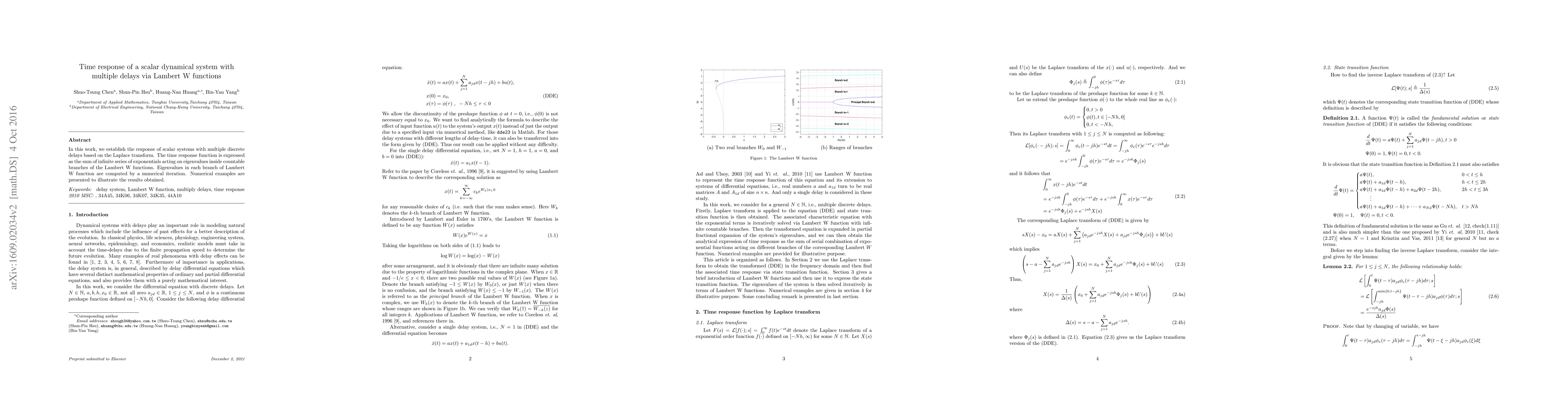 In this work, we establish the response of scalar systems with multiple discrete delays based on the Laplace transform. The time response function is expressed as the sum of infinite series of exponentials acting on eigenvalues inside countable branches of the Lambert W functions. Eigenvalues in each branch of Lambert W function are computed by a numerical iteration. Numerical examples are presented to illustrate the results obtained.