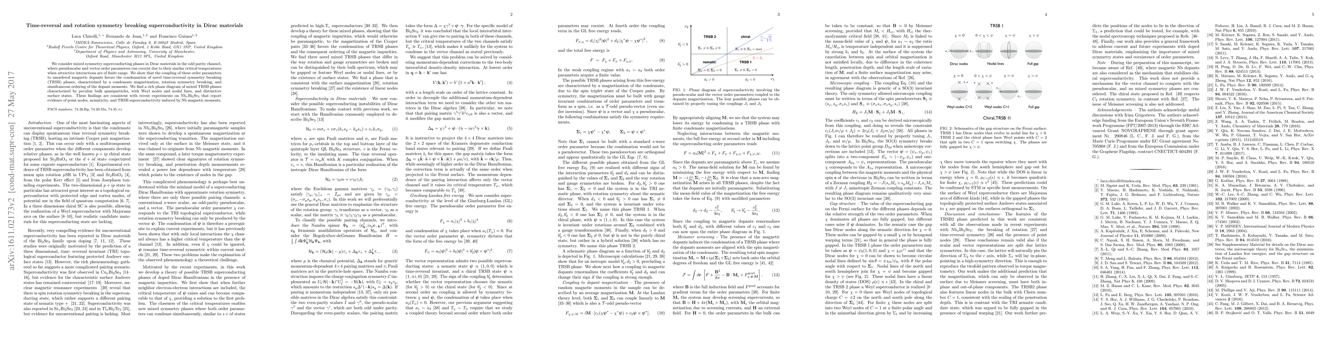 This paper explores mixed symmetry superconducting phases in Dirac materials, revealing novel time-reversal symmetry breaking (TRSB) phases driven by magnetic dopants. These phases exhibit unique bulk quasiparticles, Weyl nodes, and nodal lines, alongside distinctive surface states, corroborated by experimental findings in Nb$_x$Bi$_2$Se$_3$.