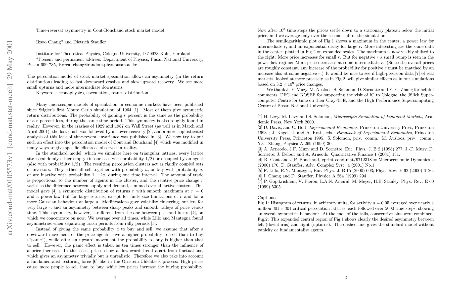 The percolation model of stock market speculation allows an asymmetry (in the return distribution) leading to fast downward crashes and slow upward recovery. We see more small upturns and more intermediate downturns.