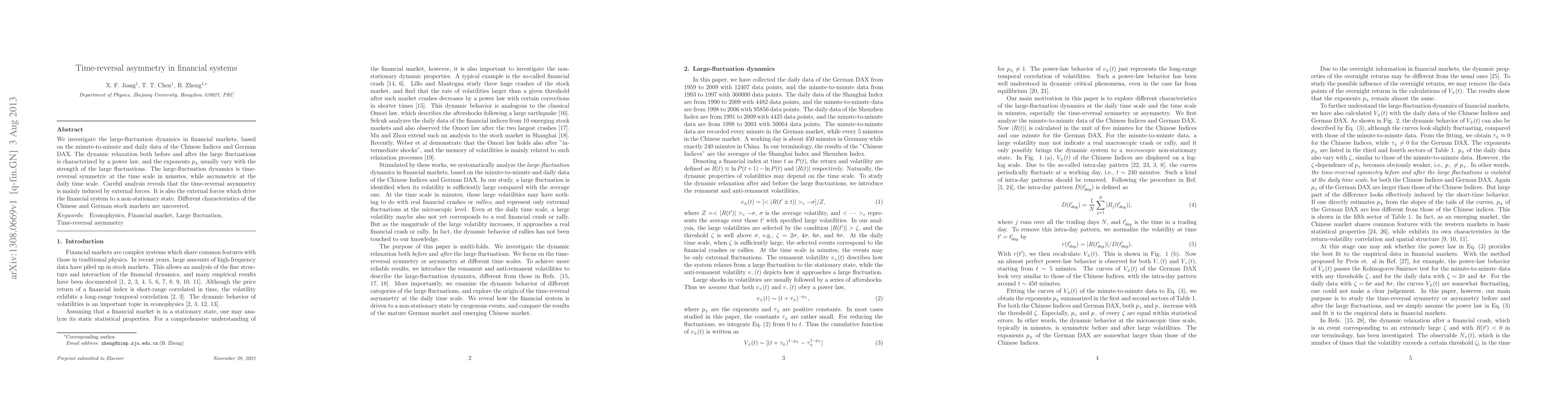 We investigate the large-fluctuation dynamics in financial markets, based on the minute-to-minute and daily data of the Chinese Indices and German DAX. The dynamic relaxation both before and after the large fluctuations is characterized by a power law, and the exponents $p_\pm$ usually vary with the strength of the large fluctuations. The large-fluctuation dynamics is time-reversal symmetric at the time scale in minutes, while asymmetric at the daily time scale. Careful analysis reveals that the time-reversal asymmetry is mainly induced by external forces. It is also the external forces which drive the financial system to a non-stationary state. Different characteristics of the Chinese and German stock markets are uncovered.