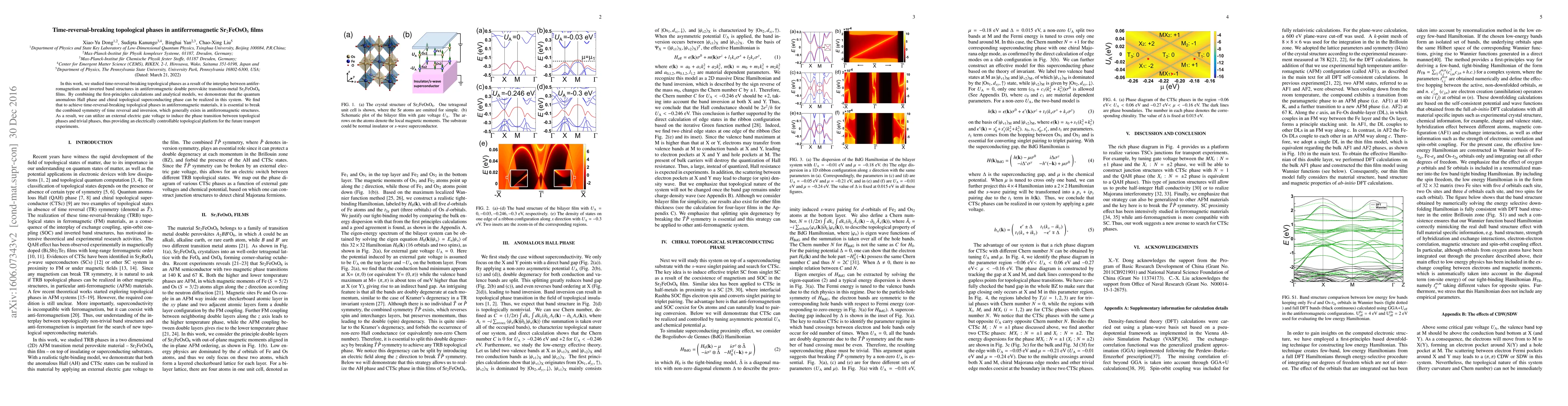 This research explores the emergence of time-reversal-breaking topological phases in antiferromagnetic Sr$_2$FeOsO$_6$ films, revealing quantum anomalous Hall and chiral topological superconducting phases. The study demonstrates that breaking the combined symmetry of time reversal and inversion is crucial for these phases, with an external electric gate voltage enabling control over phase transitions for future transport experiments.