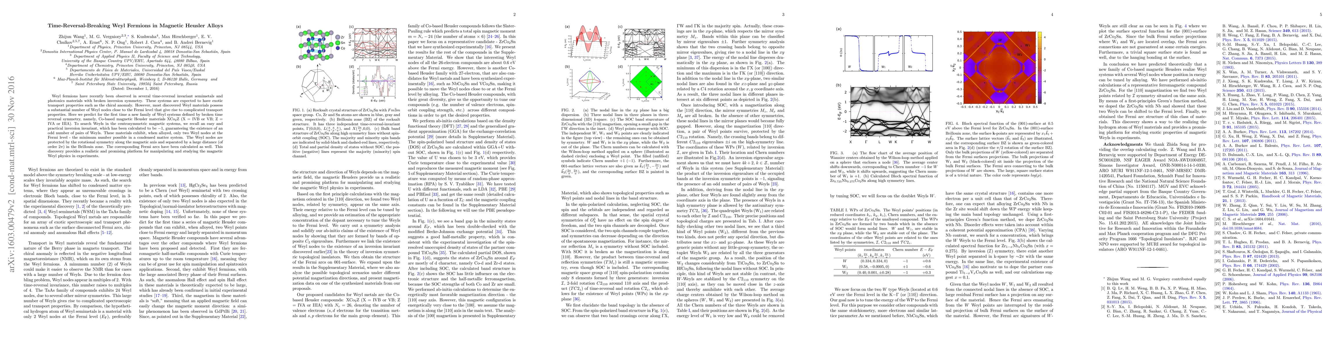 Weyl fermions have recently been observed in several time-reversal-invariant semimetals and photonics materials with broken inversion symmetry. These systems are expected to have exotic transport properties such as the chiral anomaly. However, most discovered Weyl materials possess a substantial number of Weyl nodes close to the Fermi level that give rise to complicated transport properties. Here we predict, for the first time, a new family of Weyl systems defined by broken time-reversal symmetry, namely, Co-based magnetic Heusler materials XCo2Z (X = IVB or VB; Z = IVA or IIIA). To search for Weyl fermions in the centrosymmetric magnetic systems, we recall an easy and practical inversion invariant, which has been calculated to be -1, guaranteeing the existence of an odd number of pairs of Weyl fermions. These materials exhibit, when alloyed, only two Weyl nodes at the Fermi level - the minimum number possible in a condensed matter system. The Weyl nodes are protected by the rotational symmetry along the magnetic axis and separated by a large distance (of order 2$\pi$) in the Brillouin zone. The corresponding Fermi arcs have been calculated as well. This discovery provides a realistic and promising platform for manipulating and studying the magnetic Weyl physics in experiments.