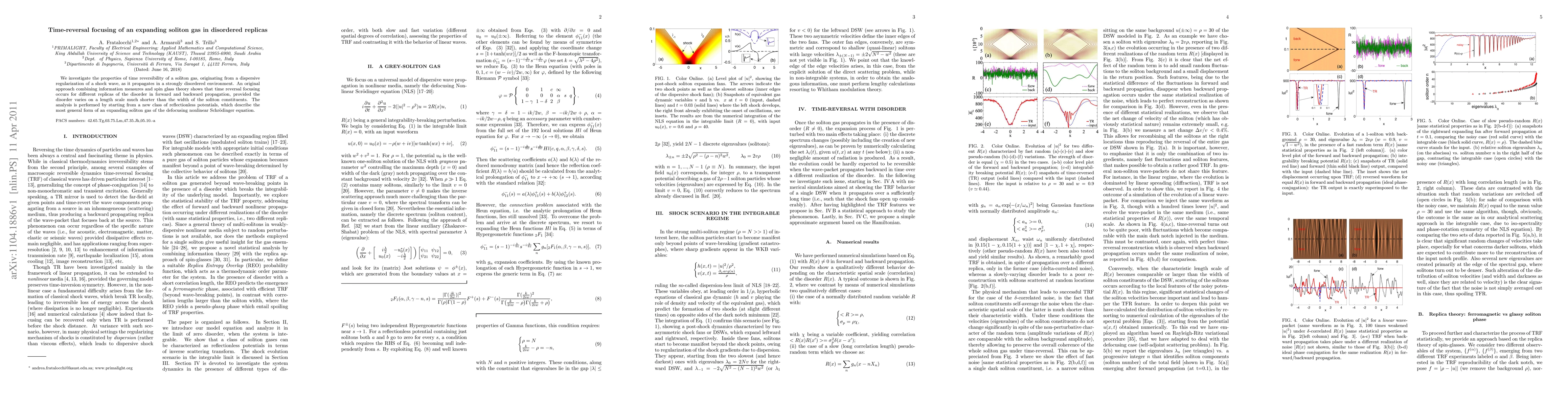 This paper explores the time-reversal focusing of an expanding soliton gas in disordered environments, revealing that focusing occurs in both forward and backward propagations for different disorder replicas. The study employs a novel combination of information measures and spin glass theory, grounded in reflectionless potentials of the defocusing nonlinear Schrödinger equation.