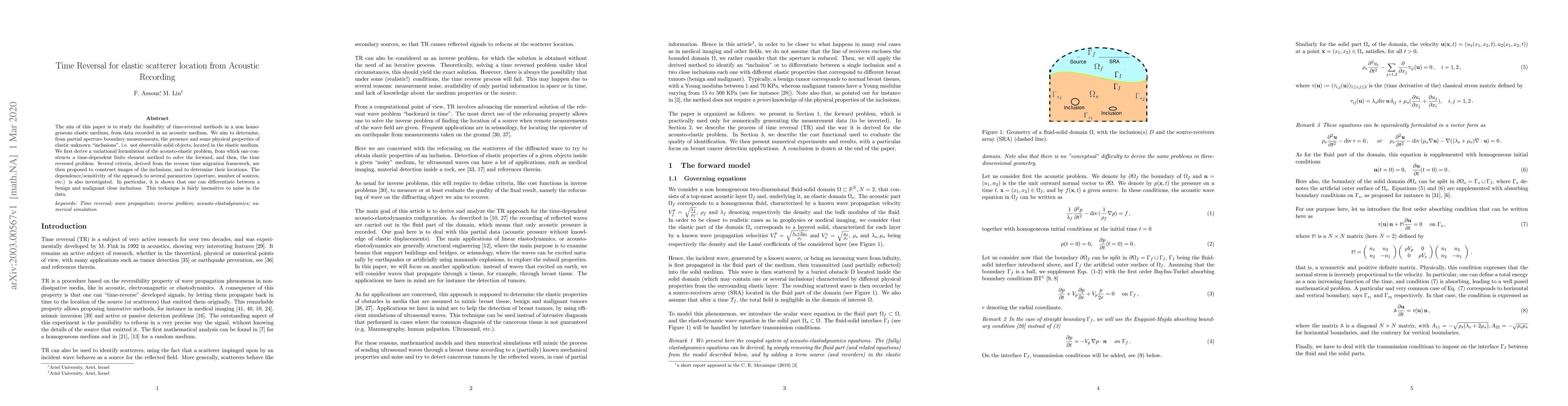 The aim of this paper is to study the feasibility of time-reversal methods in a non homogeneous elastic medium, from data recorded in an acoustic medium. We aim to determine, from partial aperture boundary measurements, the presence and some physical properties of elastic unknown "inclusions", i.e. not observable solid objects, located in the elastic medium. We first derive a variational formulation of the acousto-elastic problem, from which one constructs a time-dependent finite element method to solve the forward, and then, the time reversed problem. Several criteria, derived from the reverse time migration framework, are then proposed to construct images of the inclusions, and to determine their locations. The dependence/sensitivity of the approach to several parameters (aperture, number of sources, etc.) is also investigated. In particular, it is shown that one can differentiate between a benign and malignant close inclusions. This technique is fairly insensitive to noise in the data.