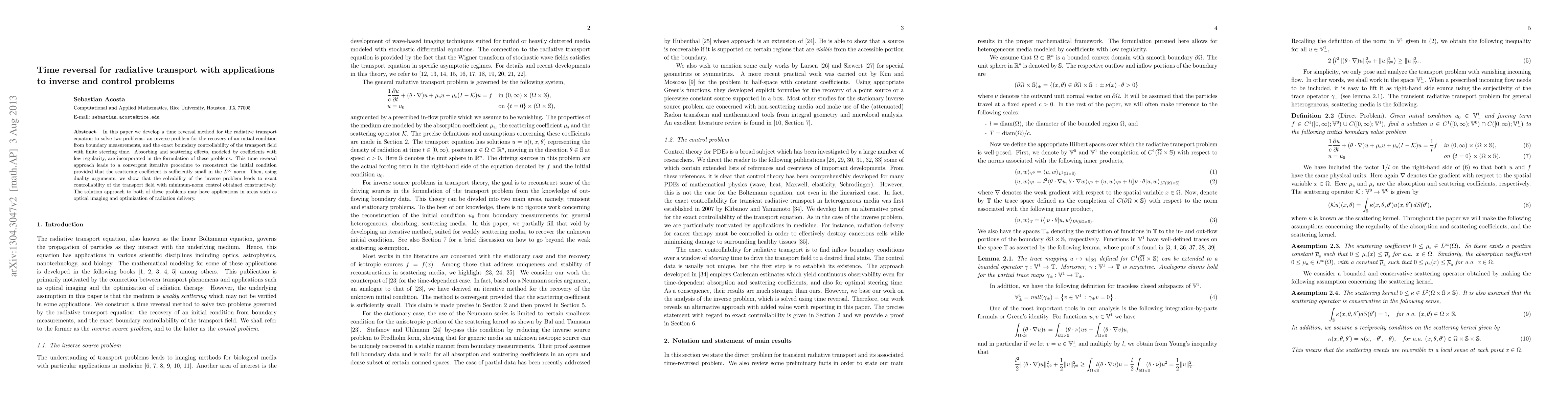A time reversal method is developed to solve inverse and control problems in radiative transport, allowing for the recovery of initial conditions from boundary measurements and exact controllability of the transport field with finite steering time.