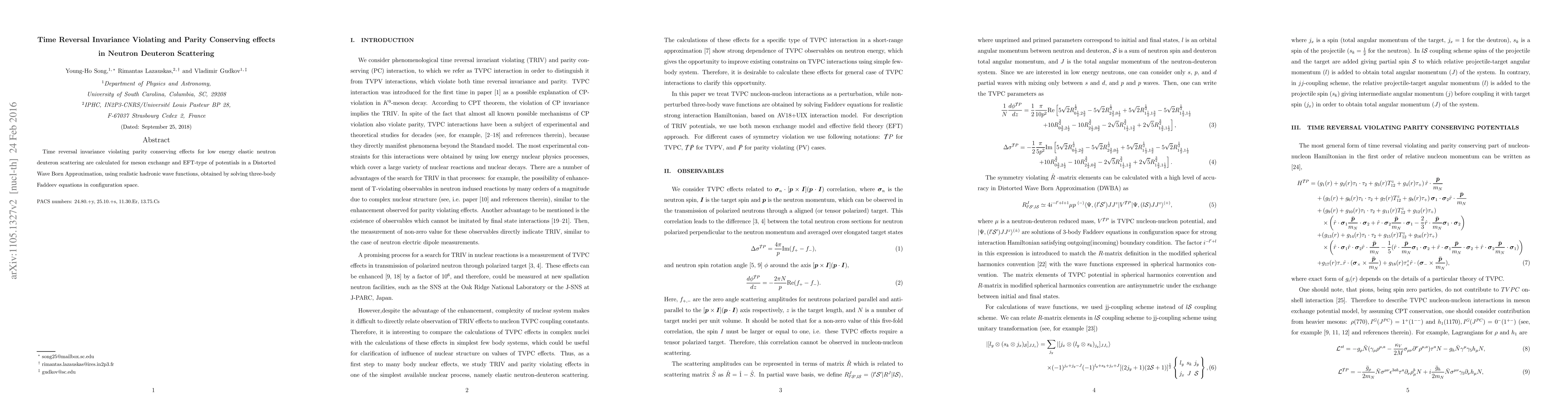 This paper calculates time reversal invariance violating but parity conserving effects in low energy neutron deuteron scattering, employing meson exchange and EFT-type potentials within a Distorted Wave Born Approximation, and using realistic hadronic wave functions derived from three-body Faddeev equations.