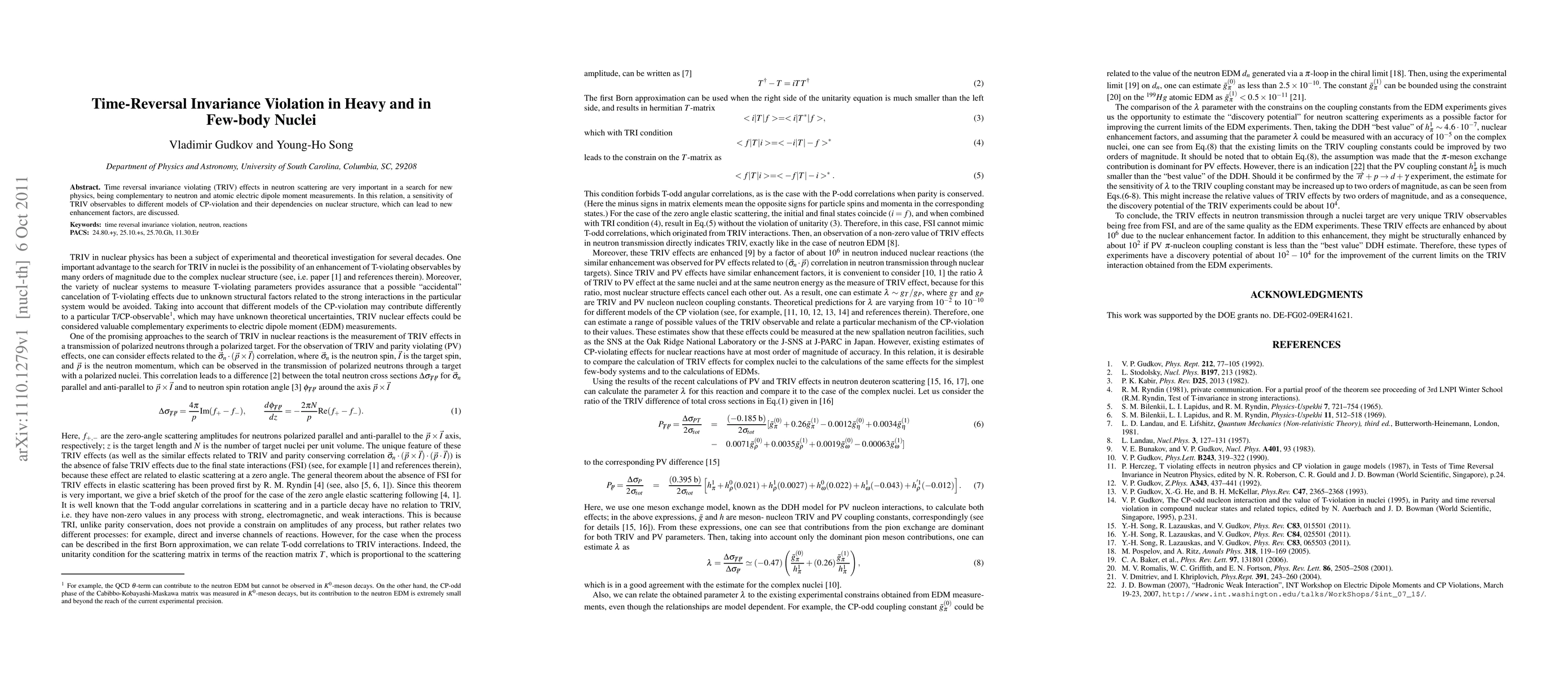 This paper investigates time-reversal invariance violation (TRIV) in neutron scattering within heavy and few-body nuclei, exploring its significance in uncovering new physics and its sensitivity to various CP-violation models and nuclear structure. The study aims to identify new enhancement factors for TRIV observables.
