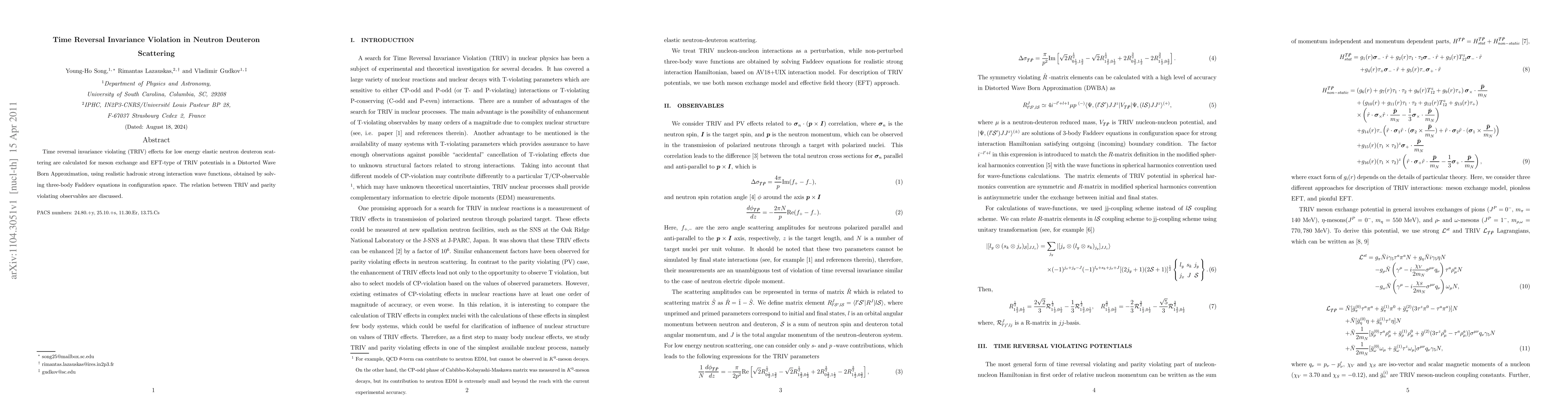 This paper calculates TRIV effects in low-energy neutron deuteron scattering using meson exchange and EFT-type potentials within a Distorted Wave Born Approximation, employing realistic wave functions from three-body Faddeev equations. It also explores the connection between TRIV and parity-violating observables.