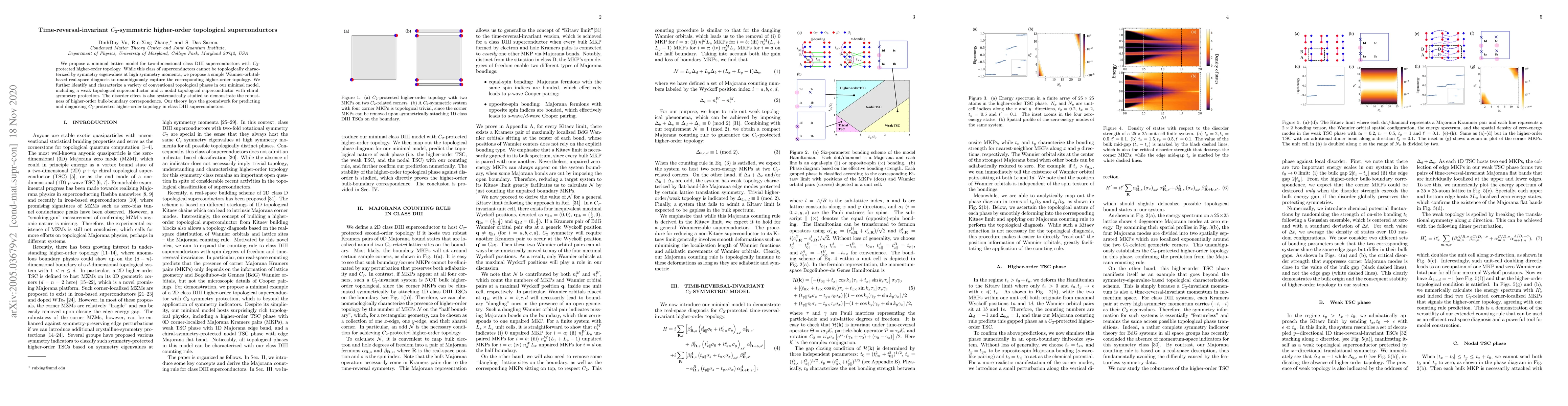 The paper proposes a minimal model for two-dimensional class DIII superconductors with $C_2$-protected higher-order topology, introducing a real-space diagnosis method to identify such topology and demonstrating the robustness of this topology under disorder. The study also characterizes various topological phases, including weak and nodal topological superconductors.