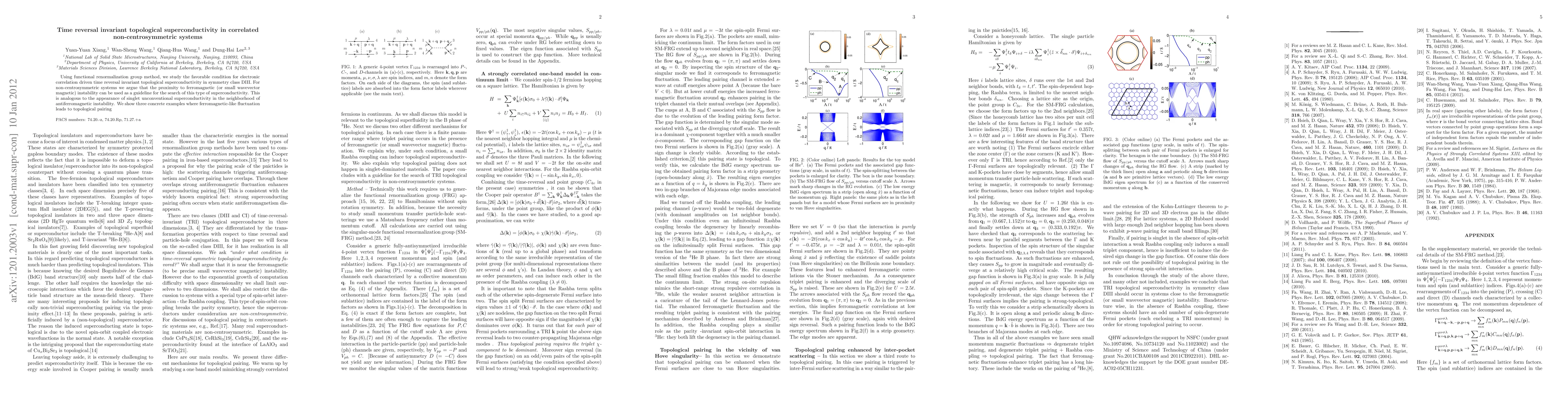 This paper investigates conditions for correlation-driven time reversal invariant topological superconductivity in non-centrosymmetric systems using the functional renormalization group method. It suggests that proximity to ferromagnetic instability, akin to antiferromagnetic instability in conventional superconductors, can guide the search for such superconductivity and provides three examples where ferromagnetic fluctuations induce topological pairing.